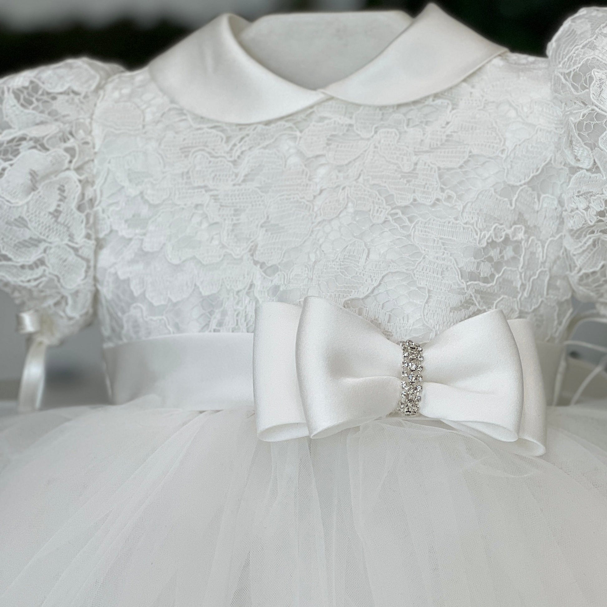 Il Luxury Dress Carlotta ha un aspetto elegante e delicato. La gonna è realizzata in tulle, con un volume vaporoso e bordi ondulati che donano un effetto leggero e raffinato. Il corpetto è in pizzo foderato, con un design ricamato floreale che aggiunge un tocco di classicità. Le maniche corte sono a palloncino, anch'esse in pizzo, creando un effetto dolce e romantico. In vita è presente un fiocco in raso bianco, al centro del quale c'è un dettaglio brillante. L'abito è completato da un colletto arrotondato che sottolinea l'eleganza del completo.