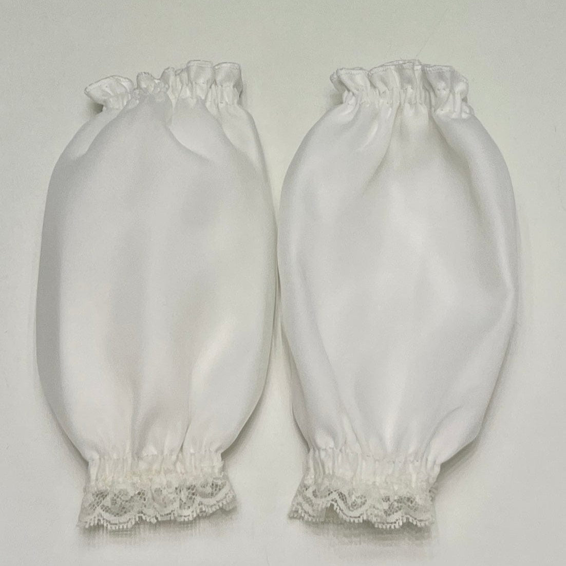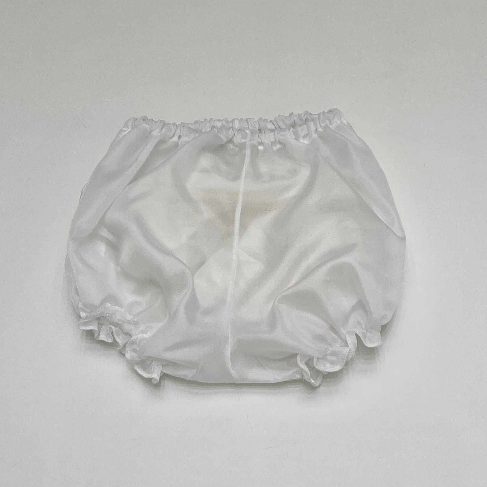 L'abito battesimale include anche manicotti coordinati e una culotte copri pannolino abbinata, che completano l'outfit della neonata per il giorno speciale del battesimo.