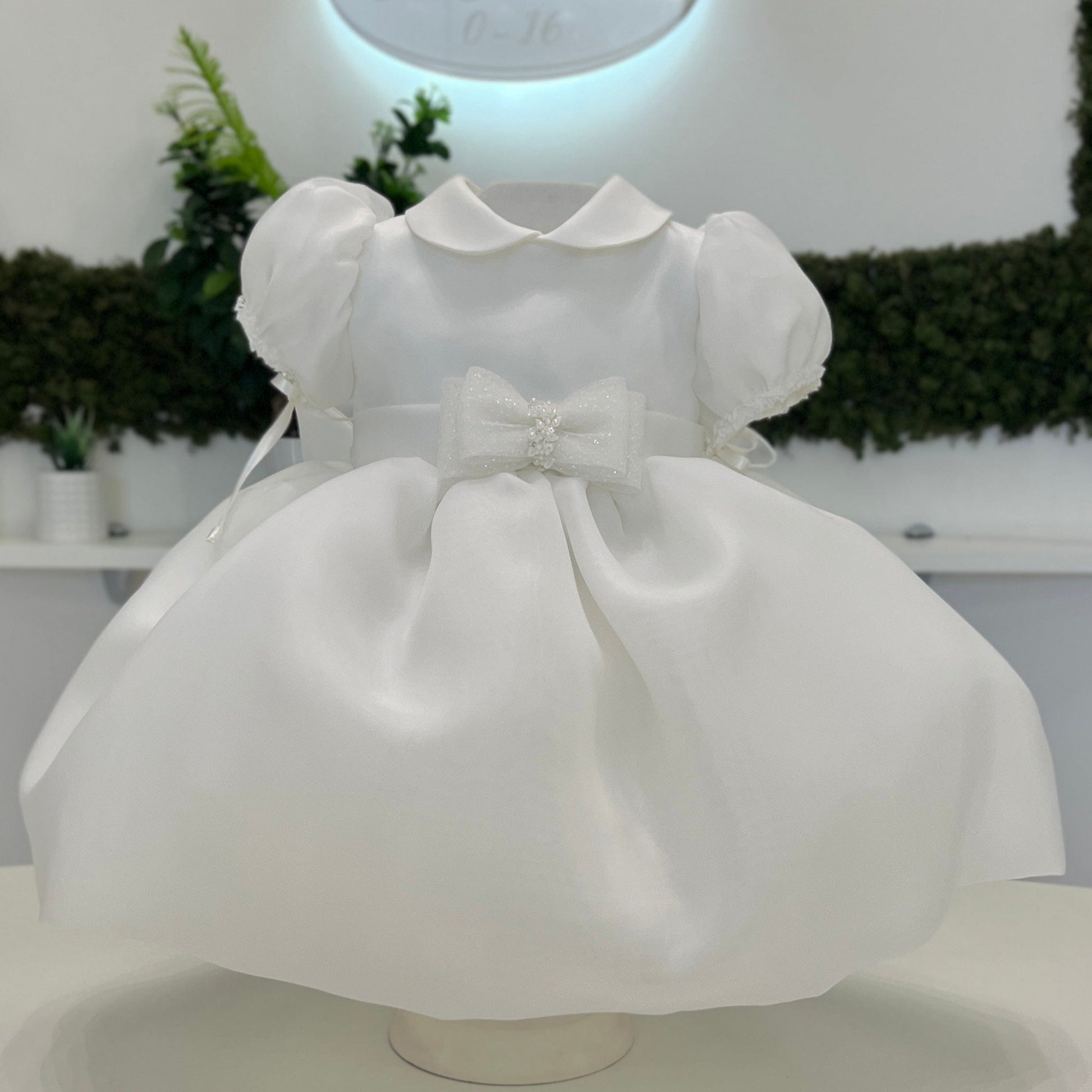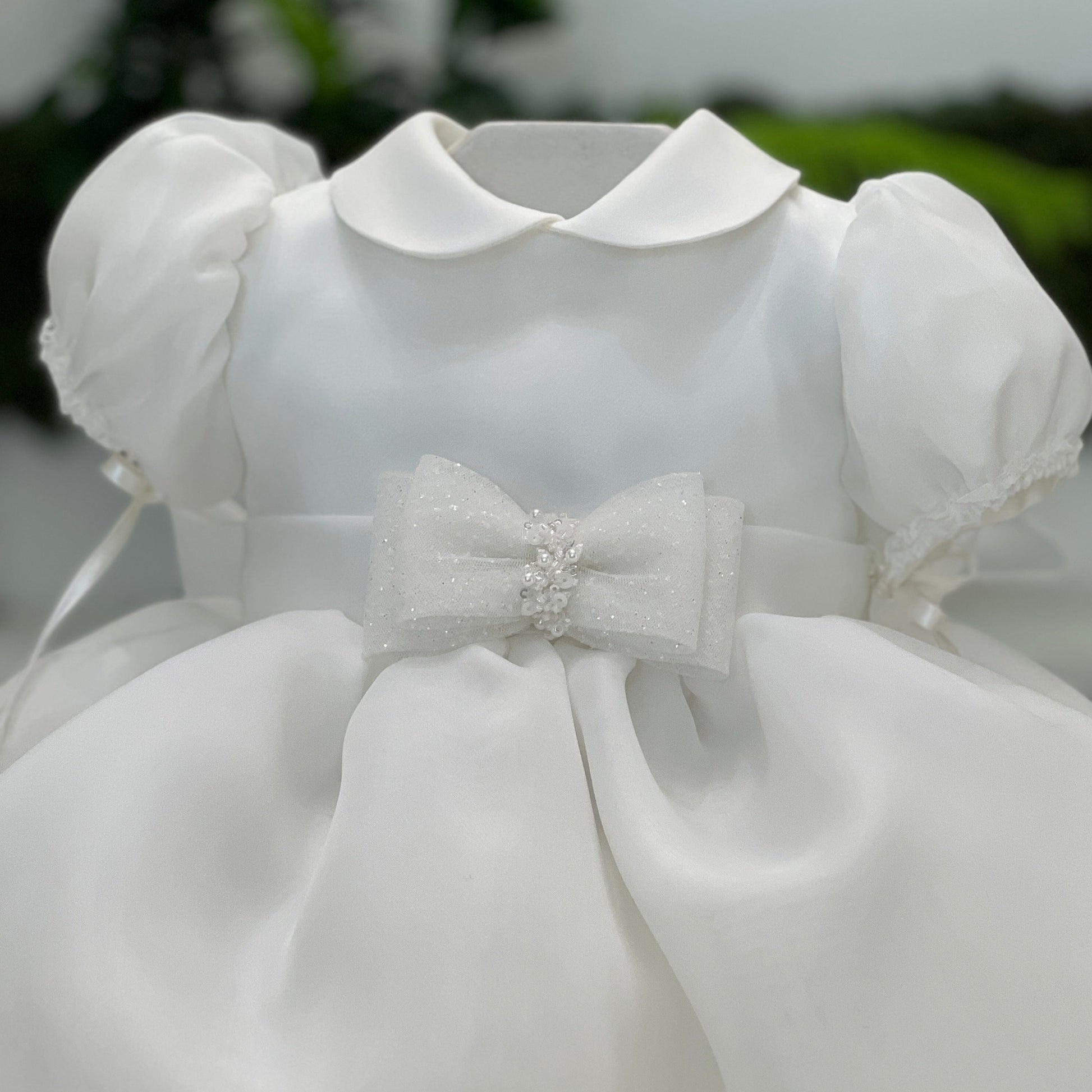 In vita, una cintura in organza si distingue per un fiocco rigido che aggiunge struttura e definizione al design. Sul retro, un morbido fiocco in organza cade delicatamente, completando l'abito con un contrasto tra rigidità e leggerezza. Questo abito è pensato per dare un tocco principesco al battesimo, unendo raffinatezza e dolcezza.
