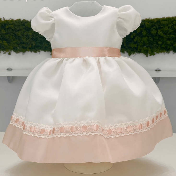 Abito da battesimo per neonato dalle linee pulite e raffinate, realizzato in tessuto bianco effetto seta per un look elegante e luminoso. La manica a palloncino aggiunge un tocco delicato, mentre la cintura in raso in vita esalta la silhouette con un accento di classe. Il dettaglio sull'orlo della gonna, con passanastro e merletto, conferisce un raffinato tocco finale. Un abito semplice ma sofisticato, ideale per il battesimo e le occasioni più speciali.