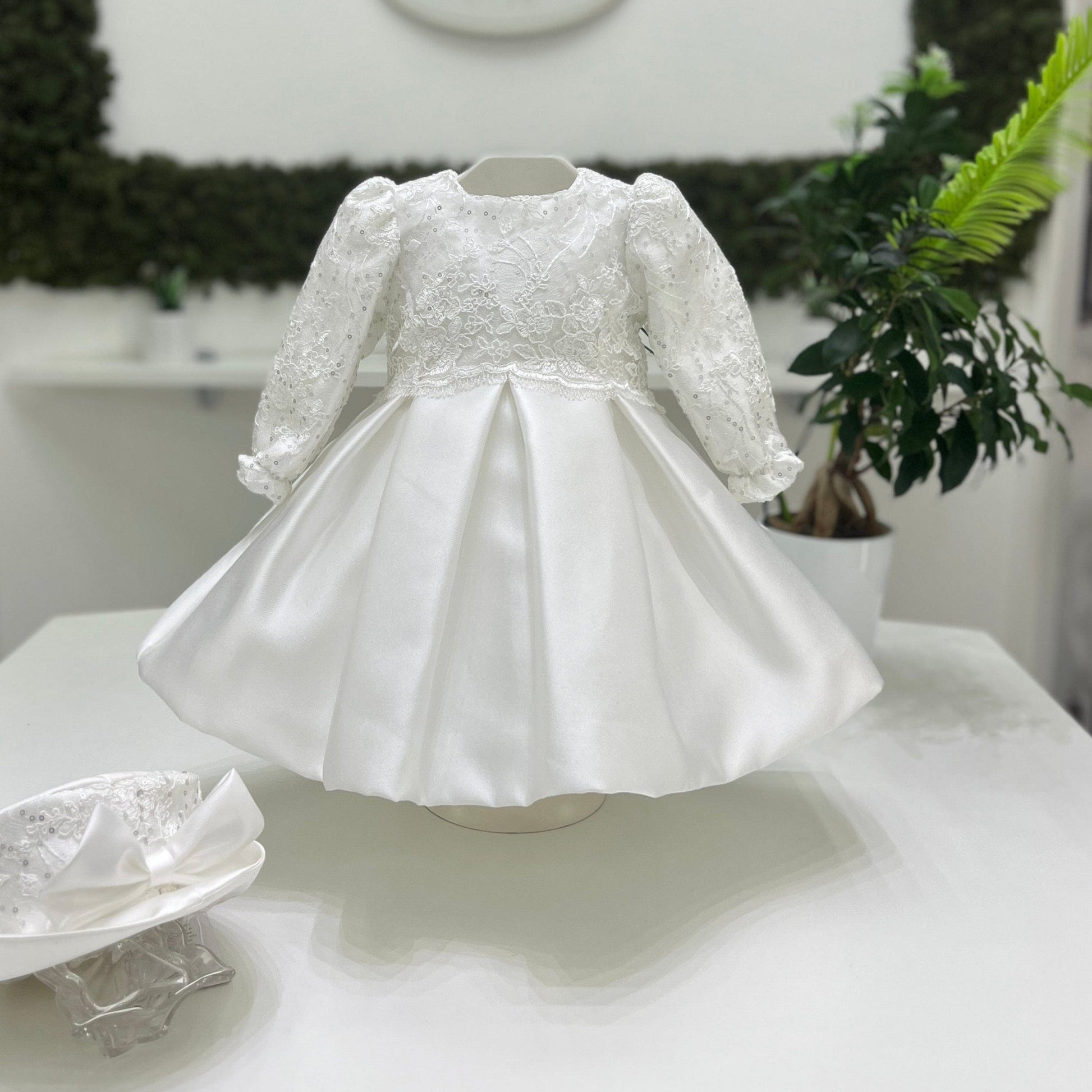 L'abito battesimale per bimba ha maniche lunghe e un corpino raffinato in pizzo, che conferisce un aspetto elegante e delicato. La gonna presenta un doppio strato: uno in pizzo decorato con paillettes, che dona un tocco brillante, e uno in mikado, un tessuto liscio e strutturato che aggiunge volume e raffinatezza all'insieme. Perfetto per una cerimonia speciale, l'abito unisce tradizione e modernità.