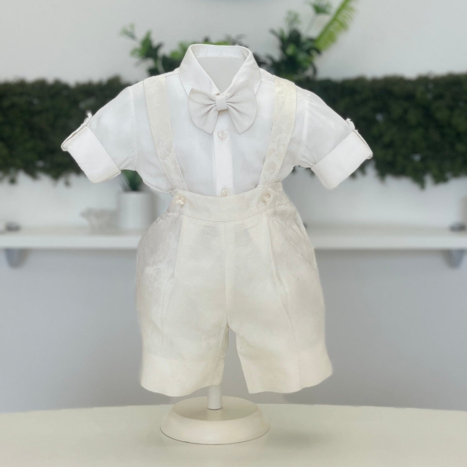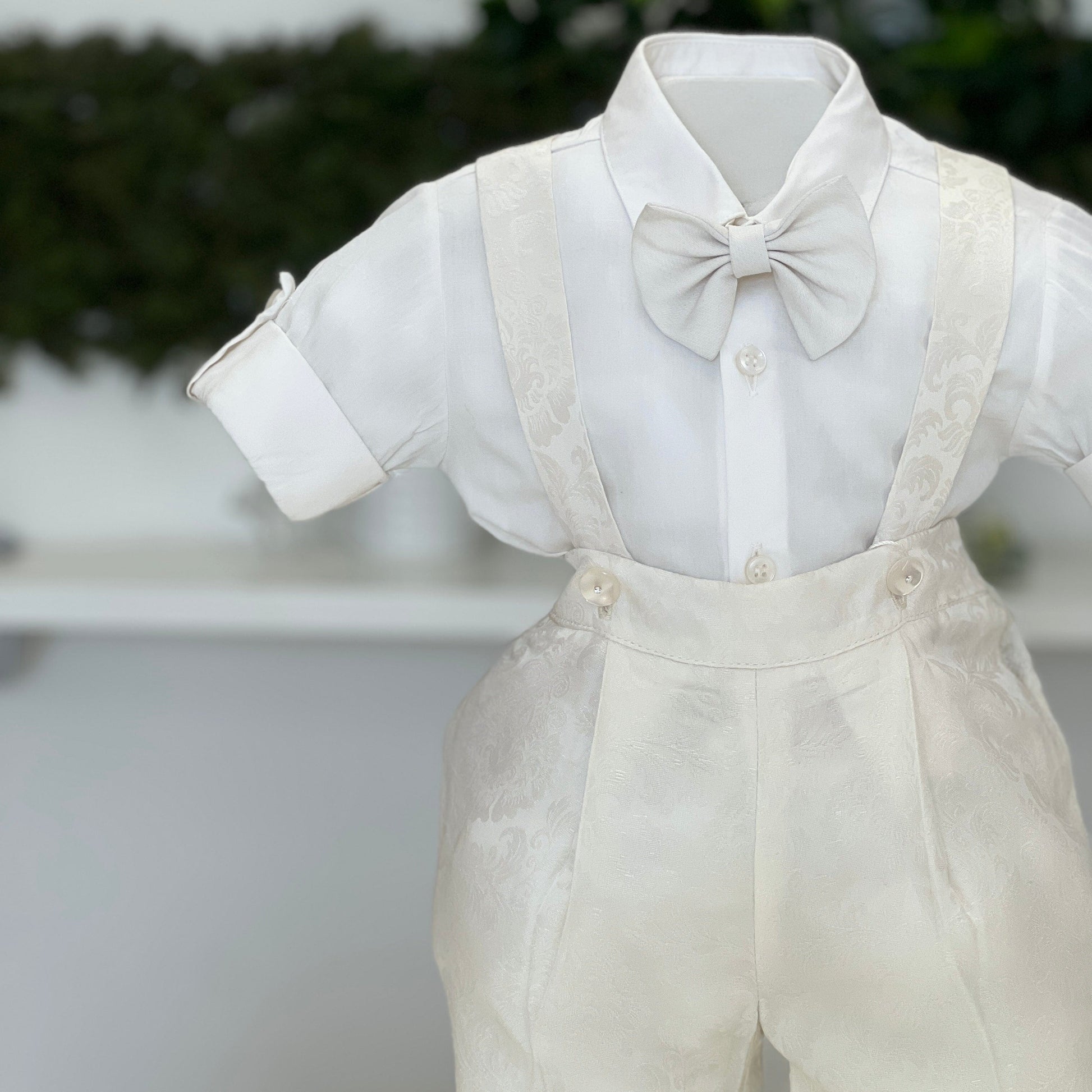 Abito battesimale composto da pantalone alla zuava con bretelle, fantasia damascato, camicia con risvolti e papillon coordinato