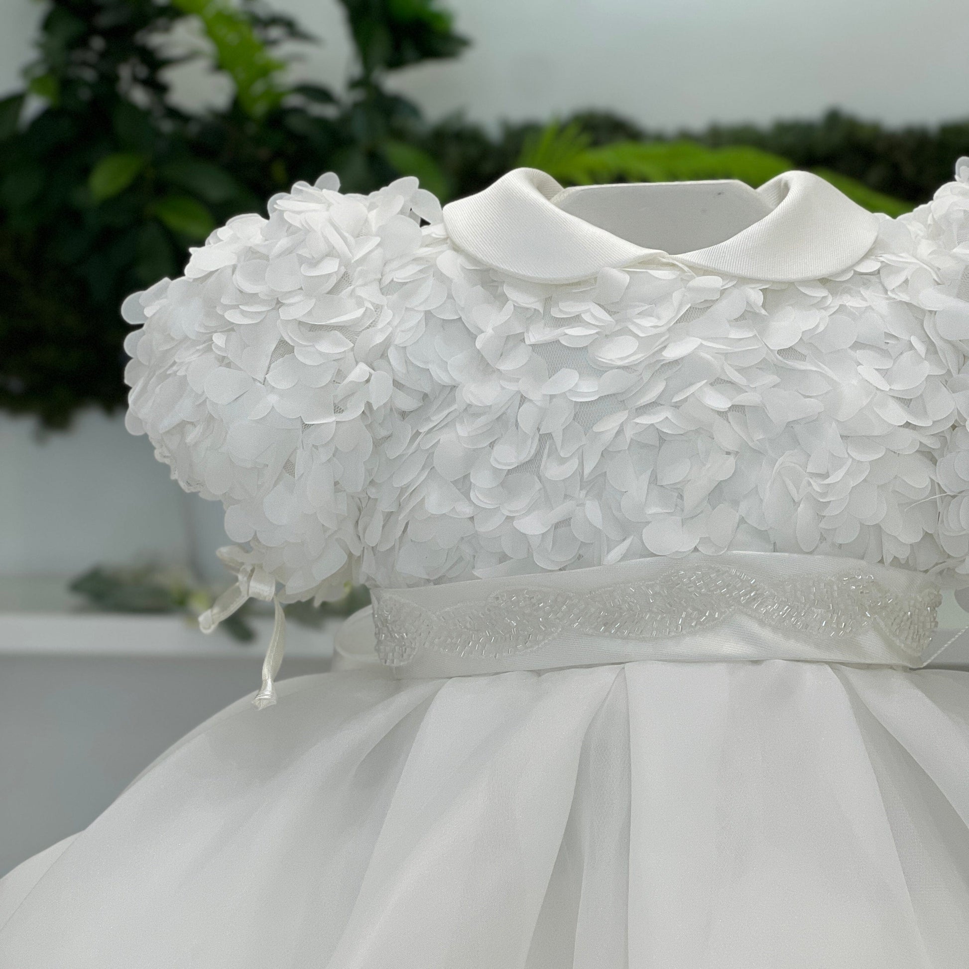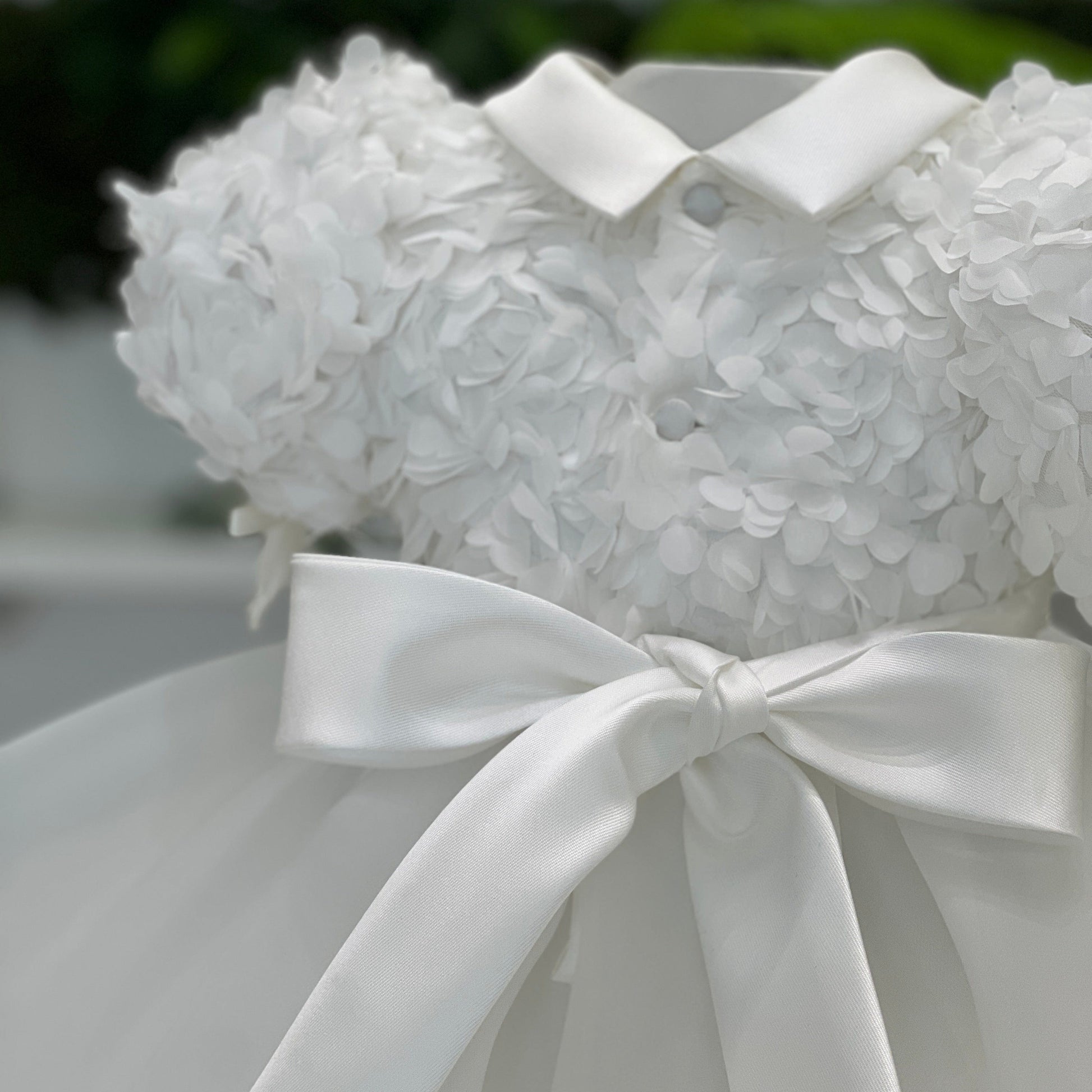 Il Luxury Dress Rosalba è un connubio di eleganza e stile, con il suo corpetto caratterizzato da un tessuto 3D a petali effetto seta che donano un aspetto sognante all'abito. Le maniche a sbuffo aggiungono un tocco romantico e delicato. La gonna, in organza di seta, è a ruota, ampia e vaporosa, conferisce volume e leggerezza all'intero abito.