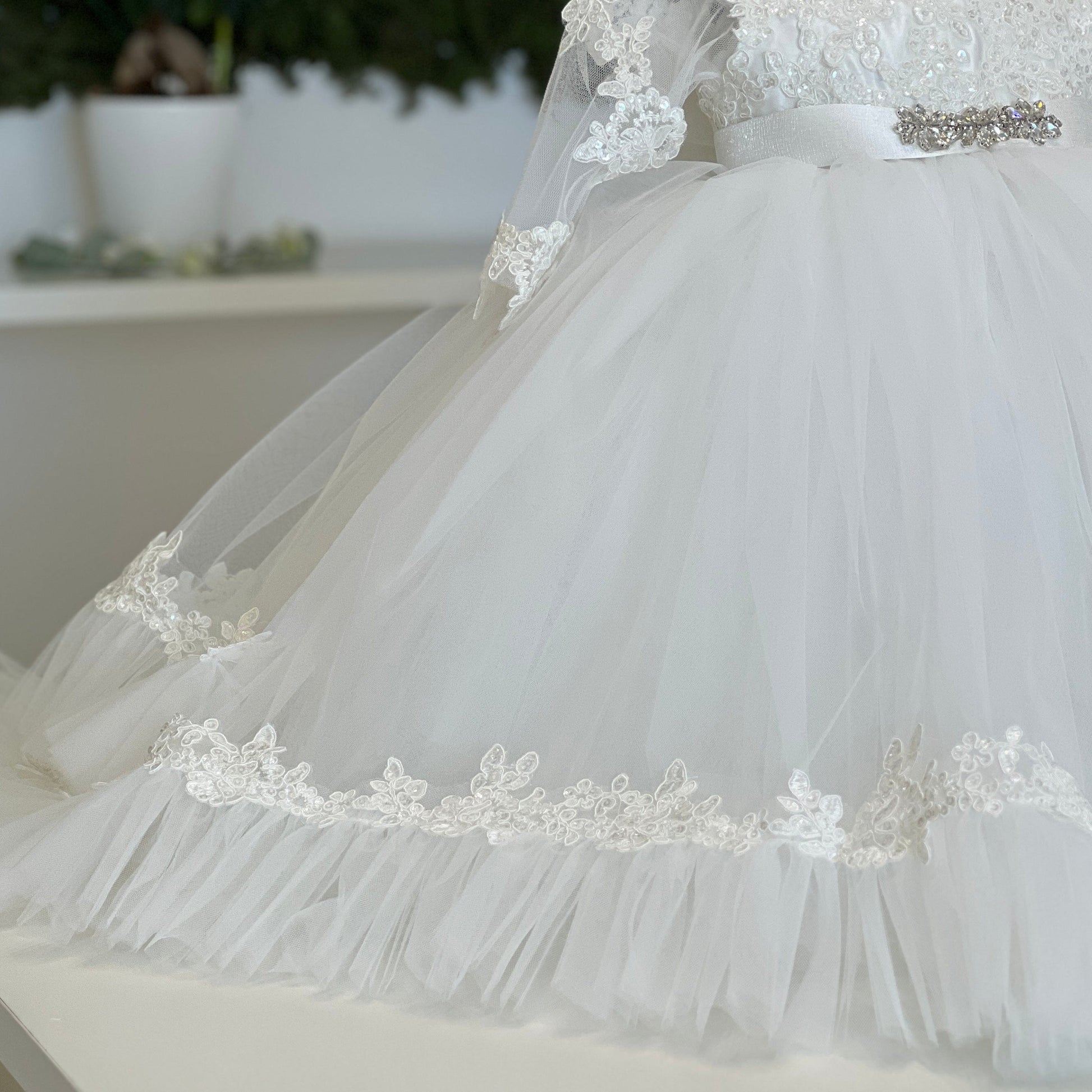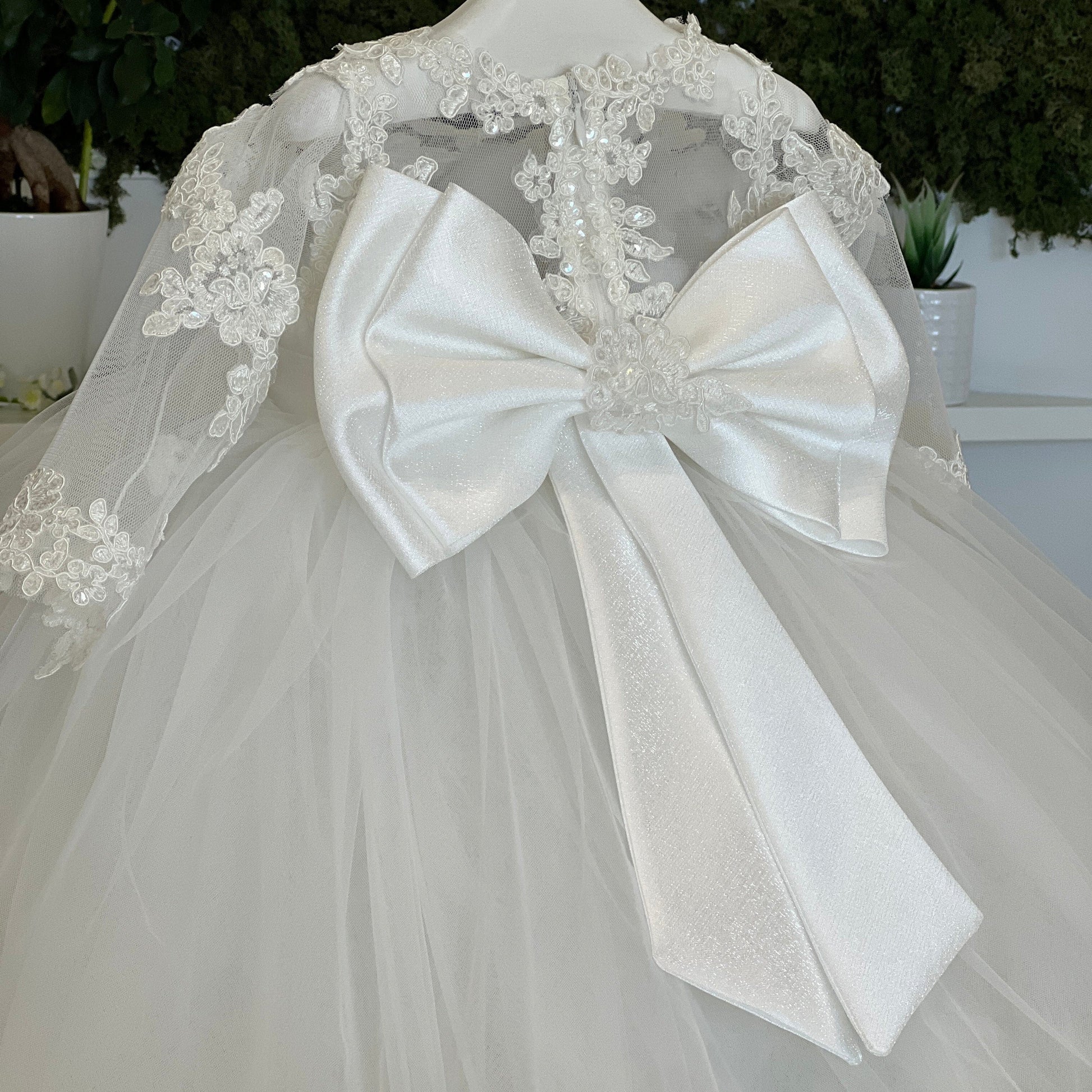 Abito battesimale sartoriale, realizzato interamente a mano per celebrare con eleganza un momento irripetibile. Tulle vaporoso, ricami floreali tridimensionali e una costruzione impeccabile: ogni dettaglio è studiato per creare un momento memorabile. Il corpino è un intreccio di perle e pizzo, definito da una cintura gioiello che segna il punto vita con precisione. Le maniche in tulle ricamato bilanciano perfettamente la silhouette. Ma è la coda — ampia, imperiale, rifinita con un maxi fiocco in raso — a dominare la scena con eleganza sovrana. Un abito che non accompagna, ma incorona.