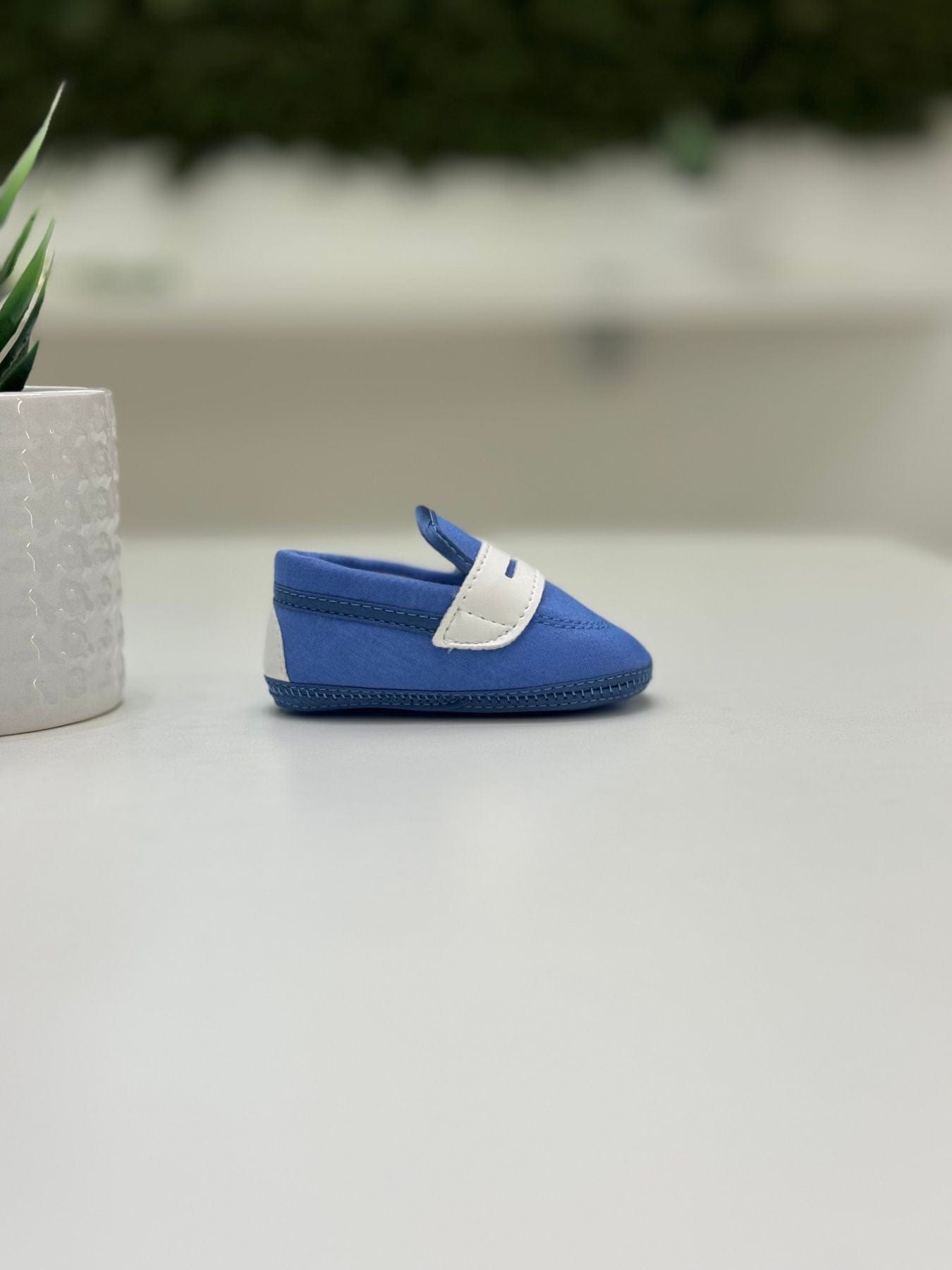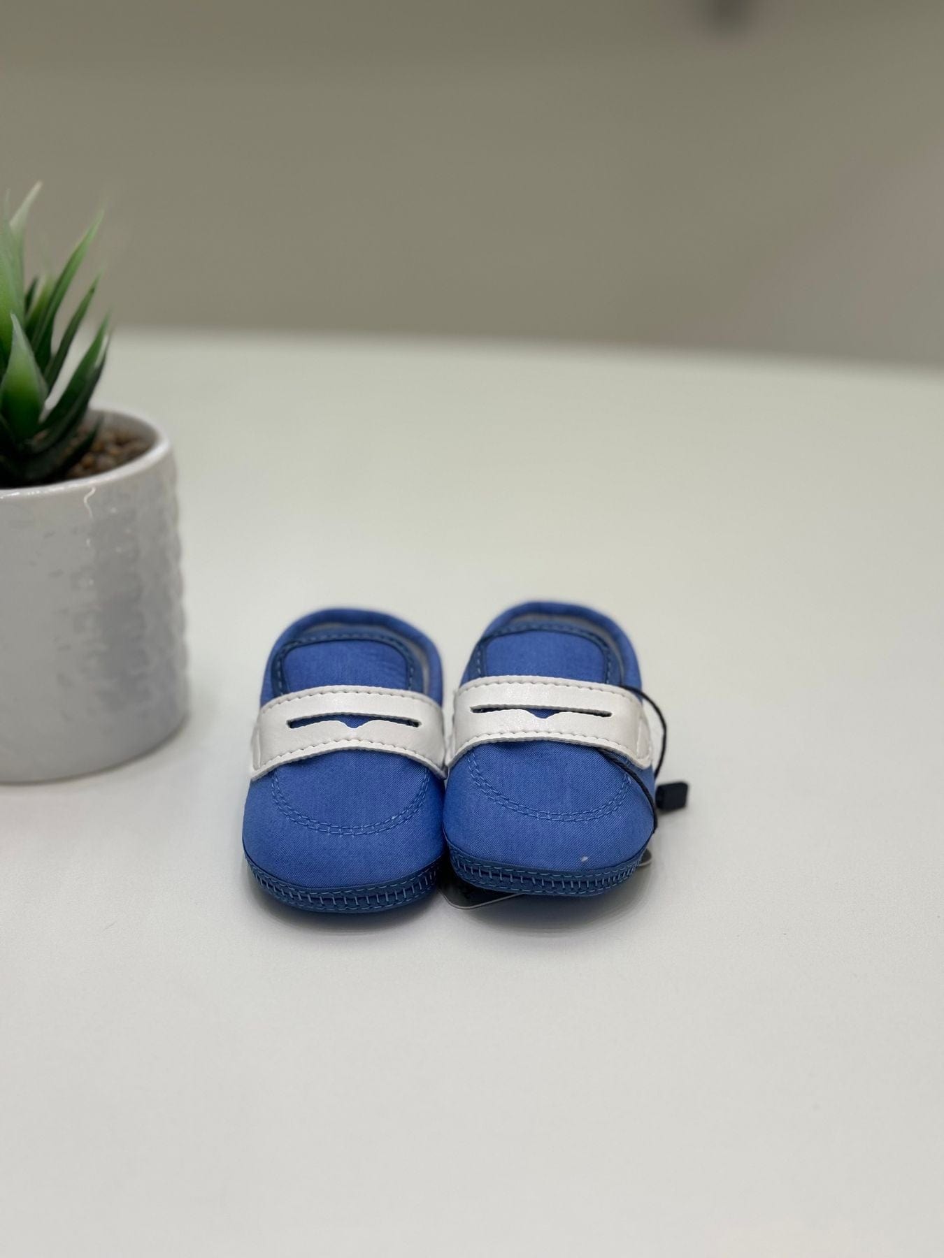 Scarpina battesimale, modello mocassino da culla in azzurro
