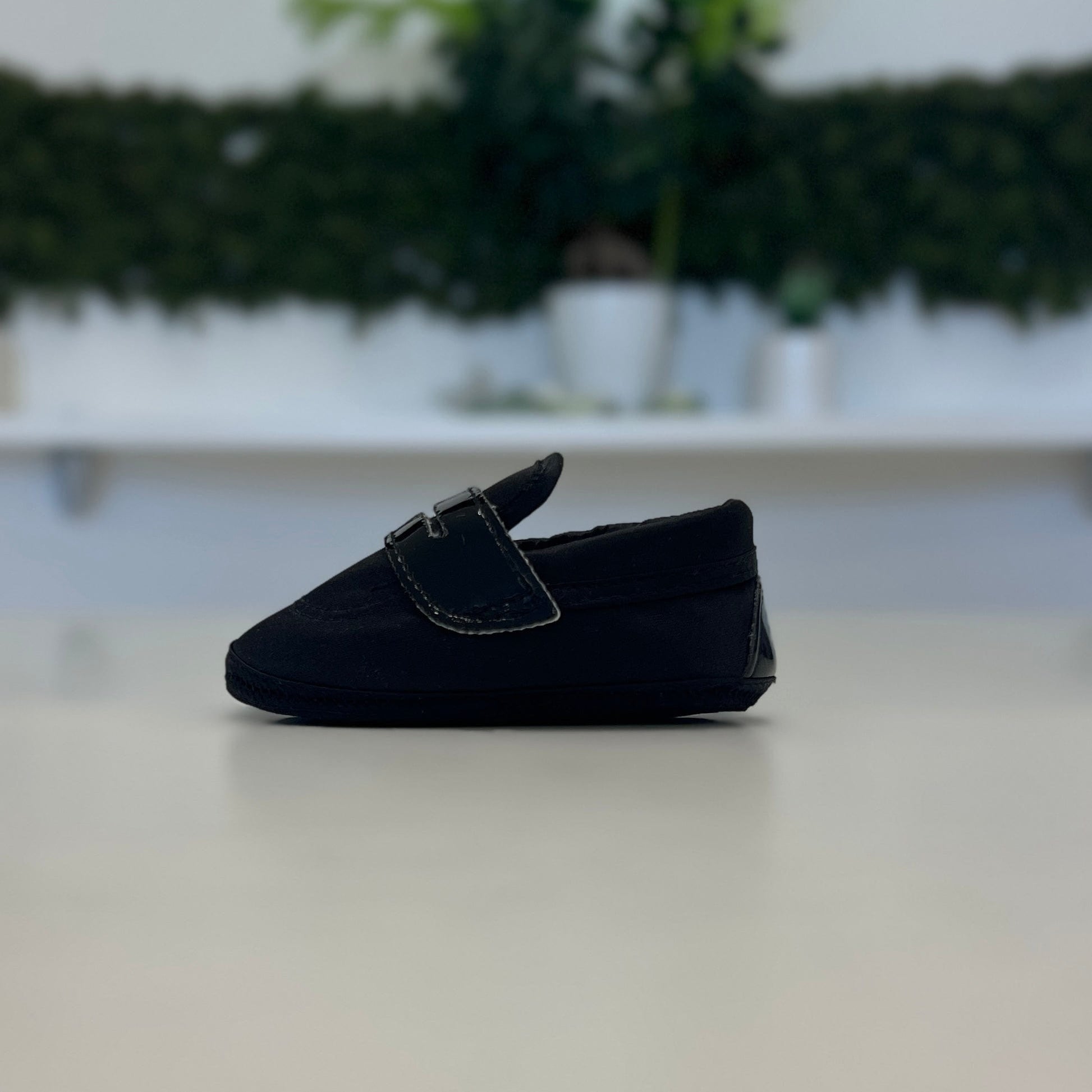 Mocassino da culla nero in morbido tessuto, con fascetta decorativa frontale. Comodo e raffinato, completa con eleganza l'abito battesimale, assicurando comfort e delicatezza per i piedini del tuo bambino.