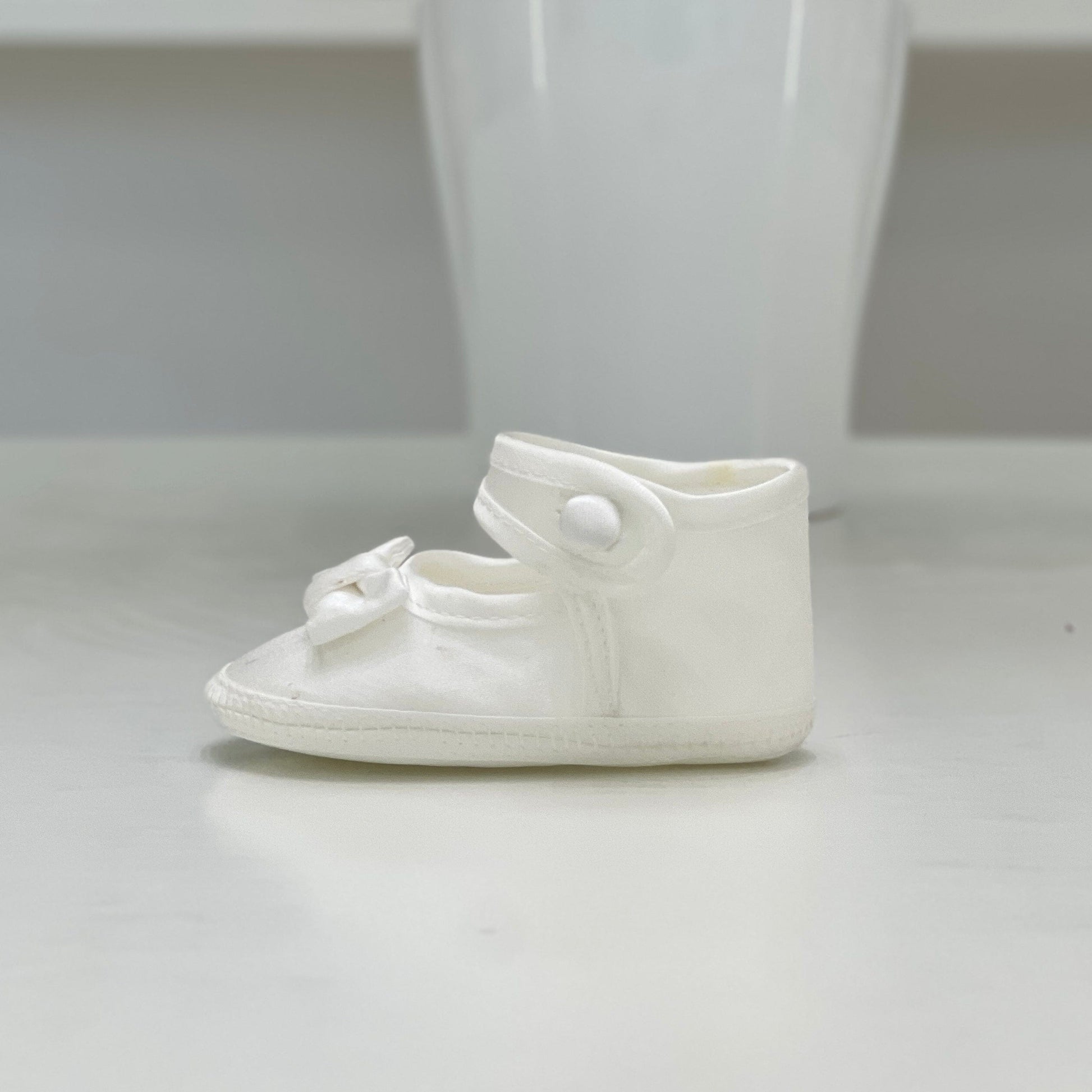 Scarpina battesimale rivestita in tessuto lucido, con chiusura laterale con bottone e fiocchetto.