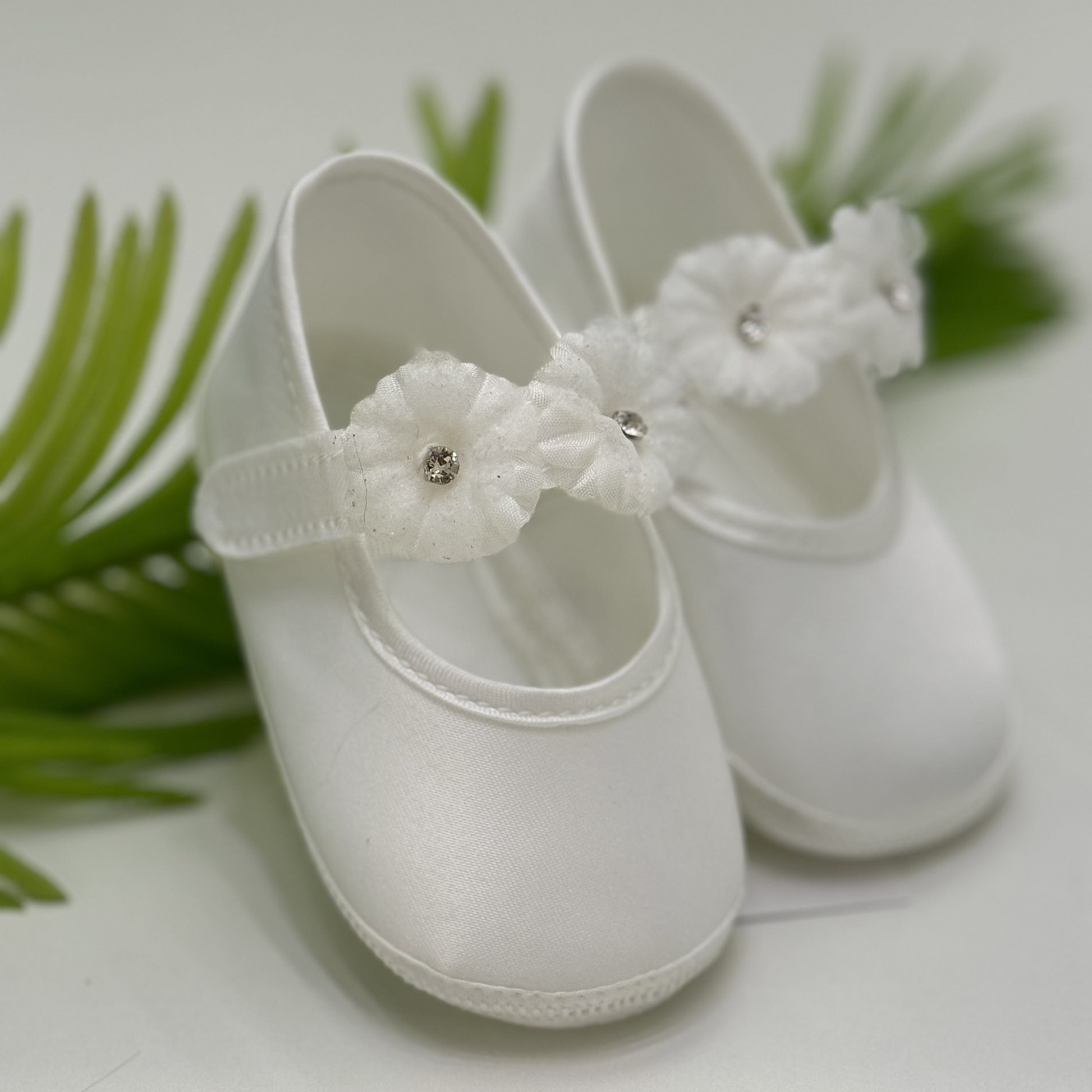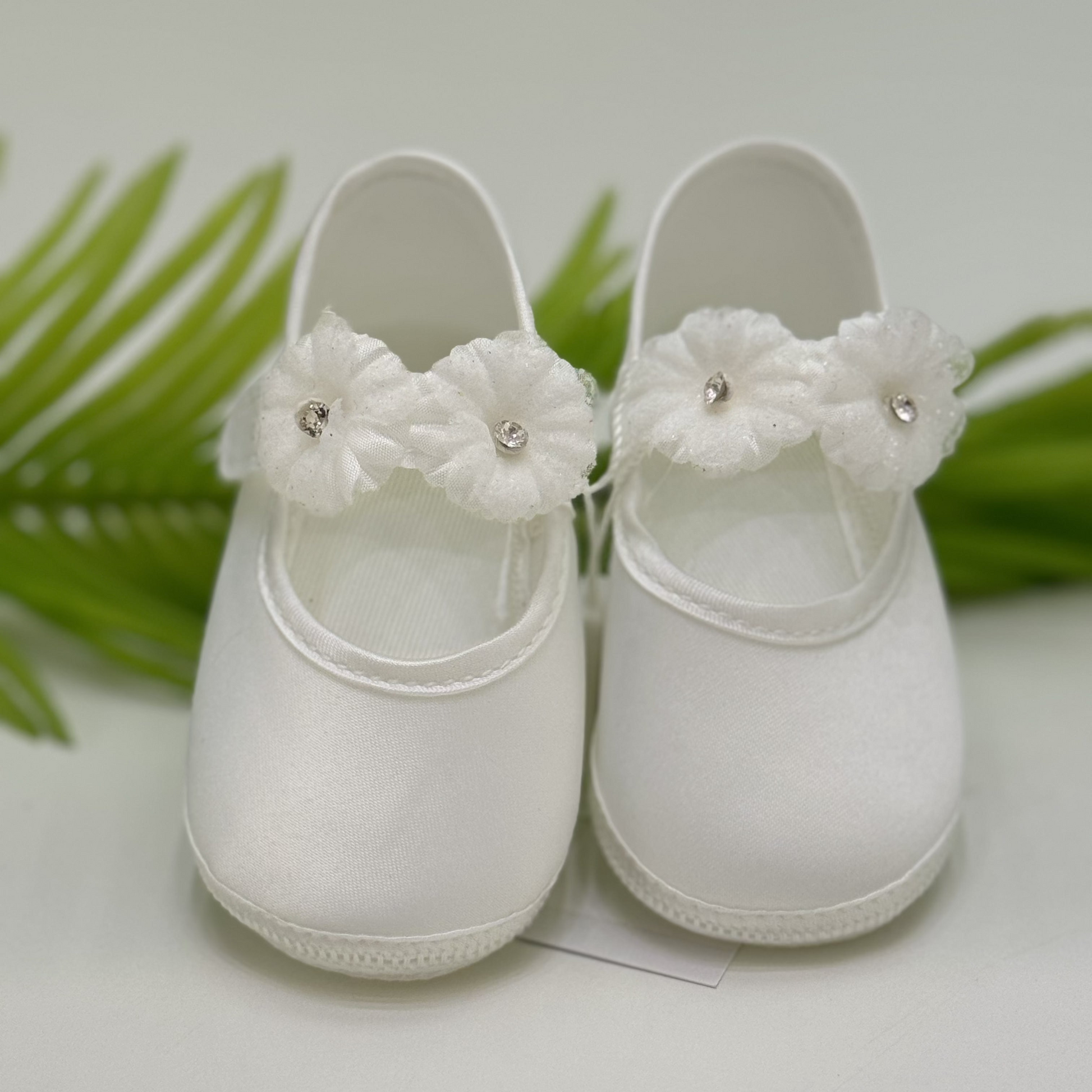 Scarpina battesimale con dettaglio floreale.