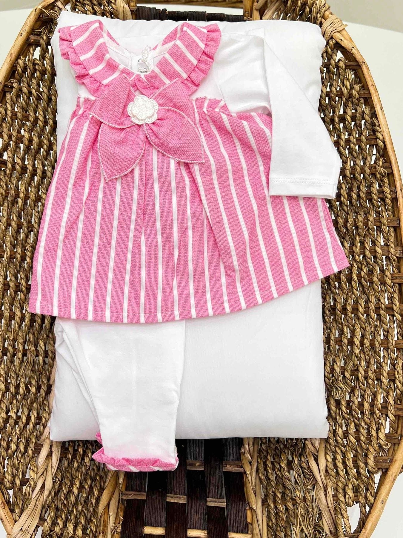 Completo nascita neonata due pezzi, in cotone e fantasia in lino fuxia a righe.