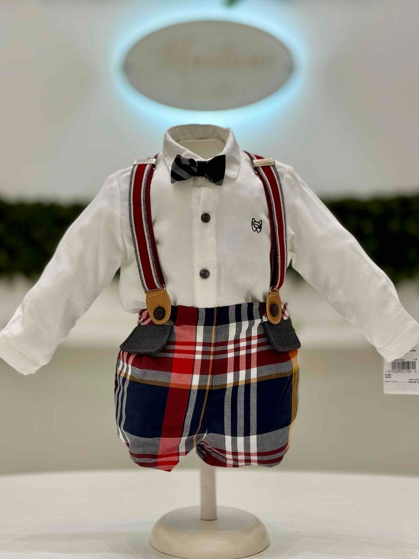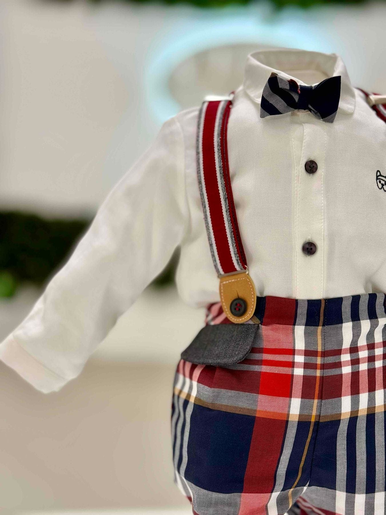 Completo pantalone corto con bretelle scozzese con camicia e papillon