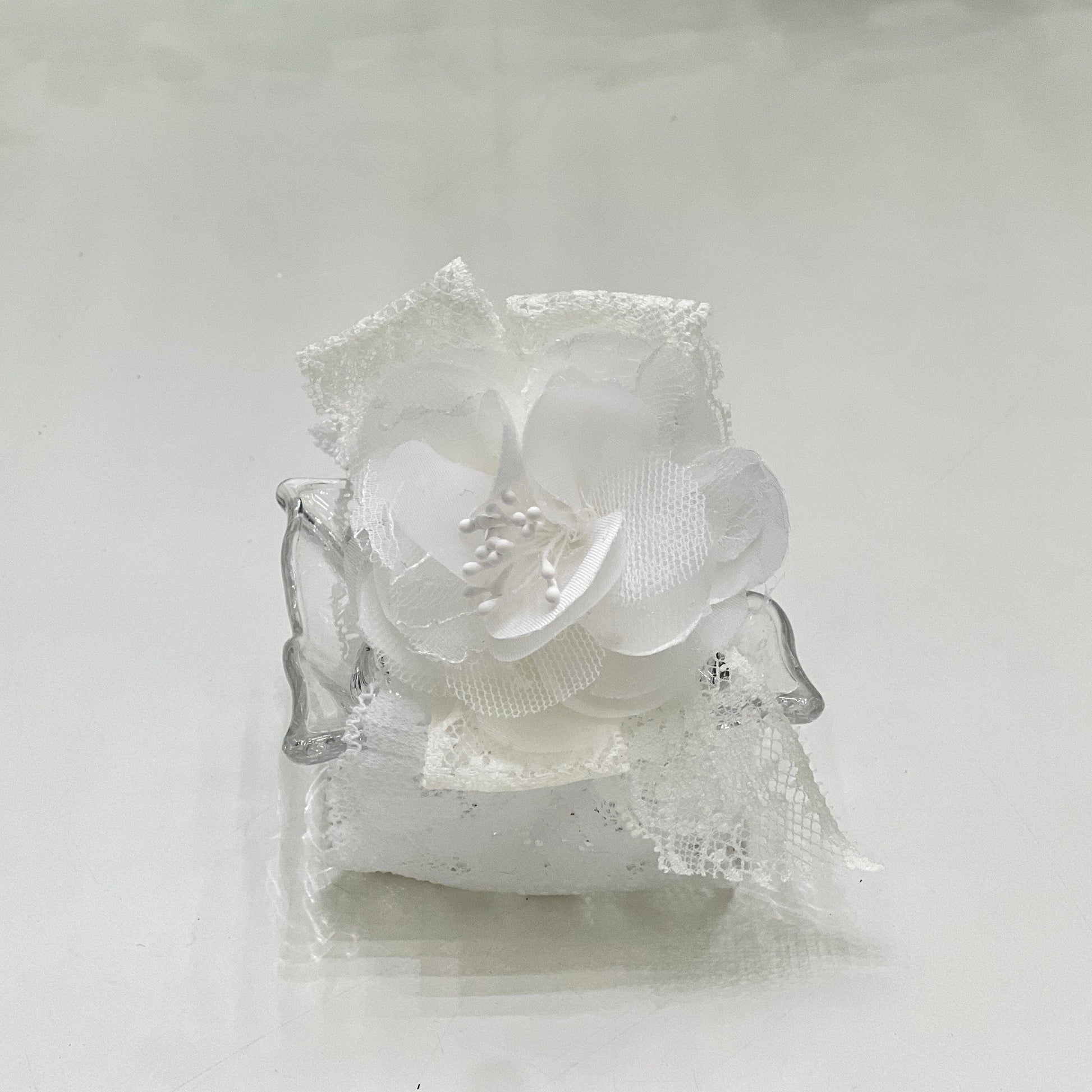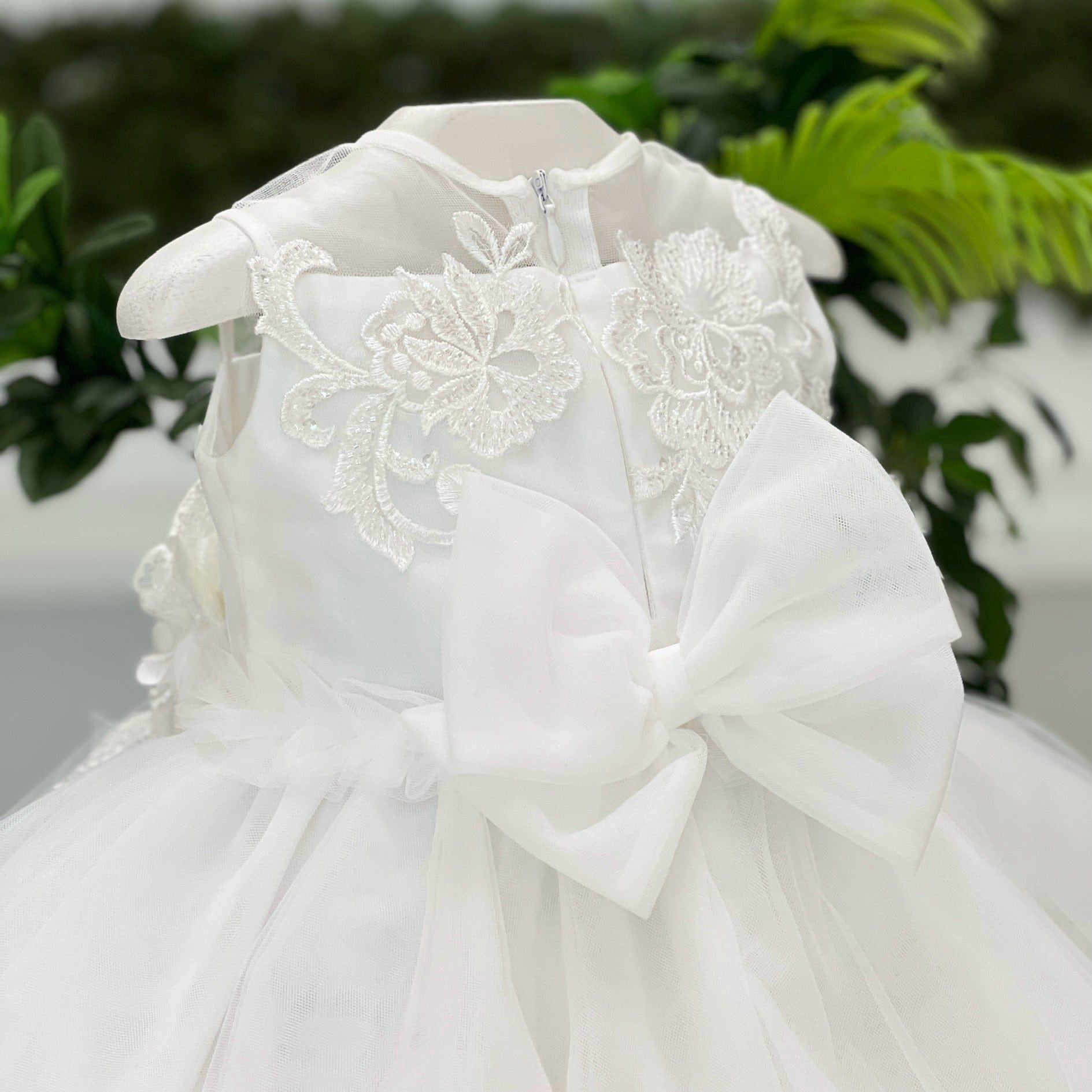Questo abito battesimale con coda è pensato per emozionare: la gonna a più strati regala un effetto ampio e vaporoso, mentre il corpino con applicazioni in pizzo aggiunge un tocco di eleganza artigianale. In vita, un delicato fiore decorativo completa il look con grazia e armonia.