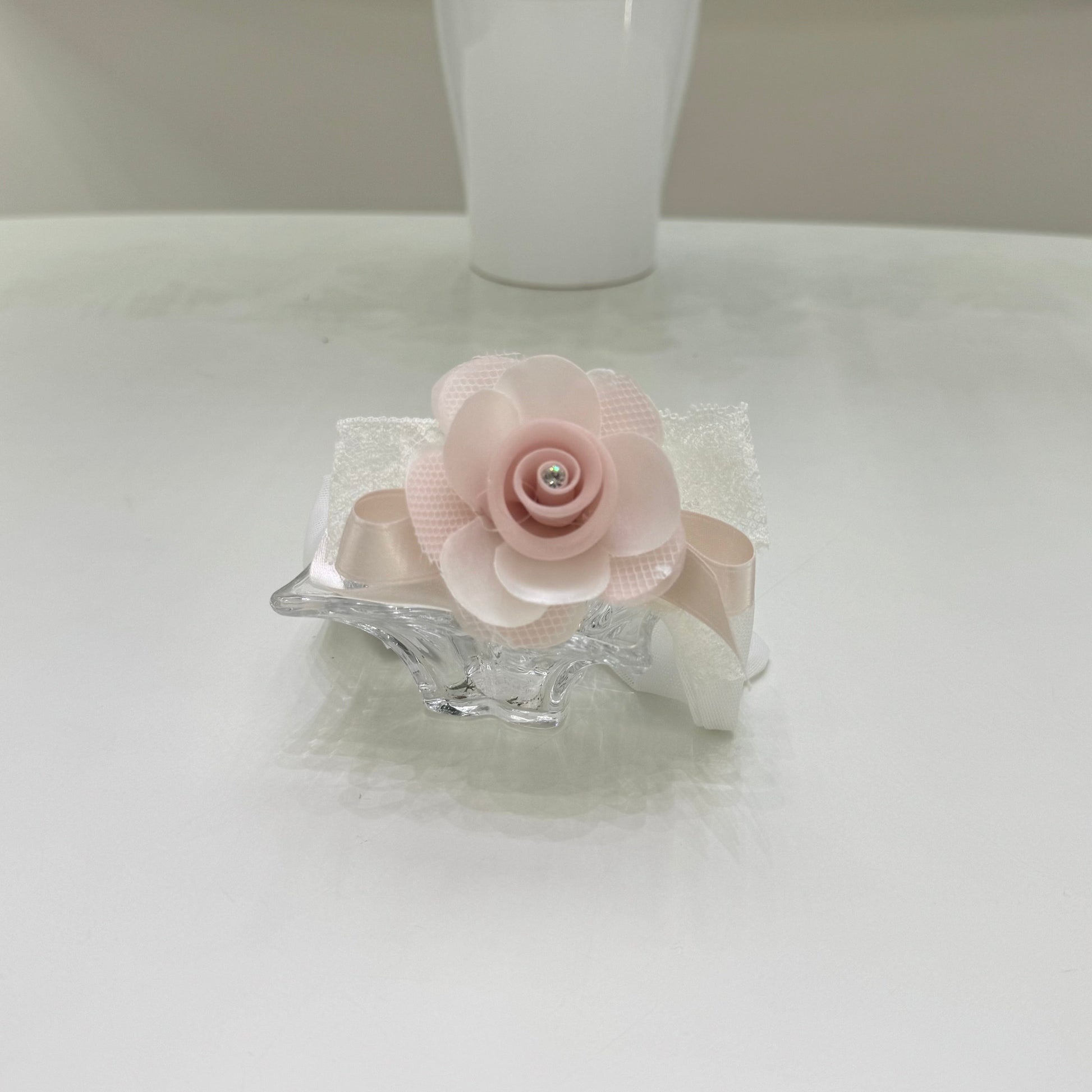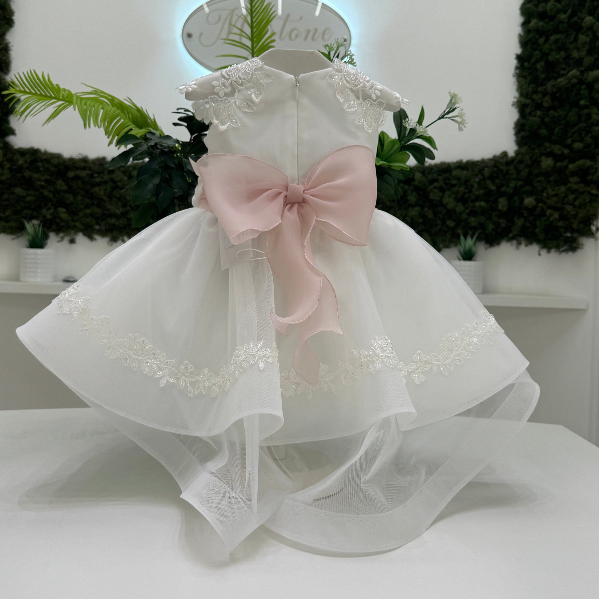 Un abito battesimale raffinato e fiabesco. Il corpetto in pizzo macramè, illuminato da punti luce, si unisce con eleganza alla gonna in organza, impreziosita da una coda con doppia balza, bordata con crine per un tocco vaporoso. Una delicata cintura rosa cipria, arricchita da un dettaglio floreale, si chiude sul retro con un romantico fiocco. Perfetto per un battesimo da sogno.