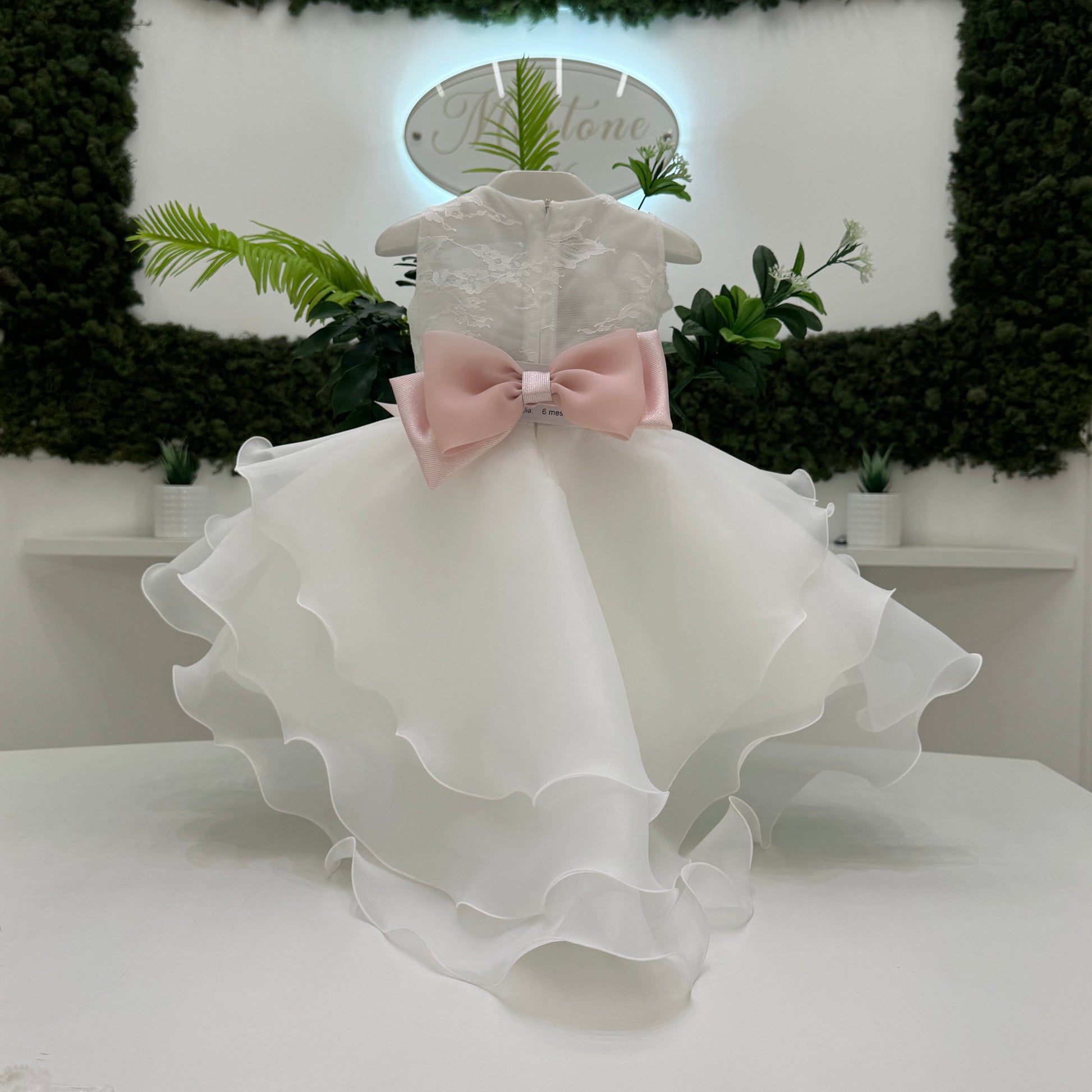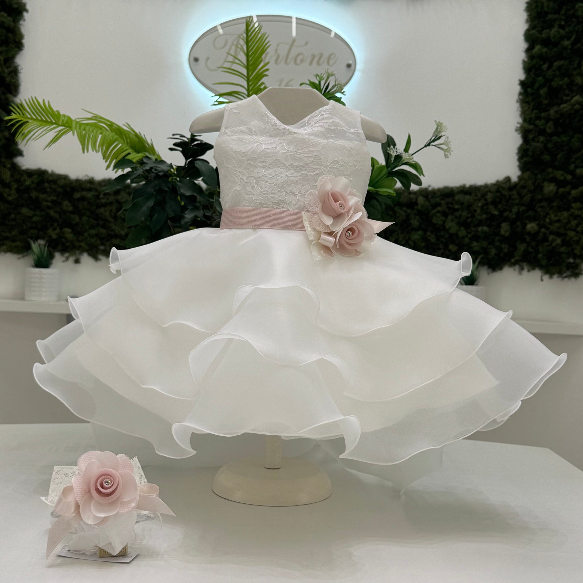 Un abito battesimale dal fascino incantevole. Il corpetto in pizzo ricamato si abbina con eleganza alla gonna a balze in organza, arricchita da una coda sul retro che dona leggerezza e movimento. La cintura in vita, impreziosita da un dettaglio floreale, si chiude con un fiocco romantico. Perfetto per un’occasione indimenticabile.