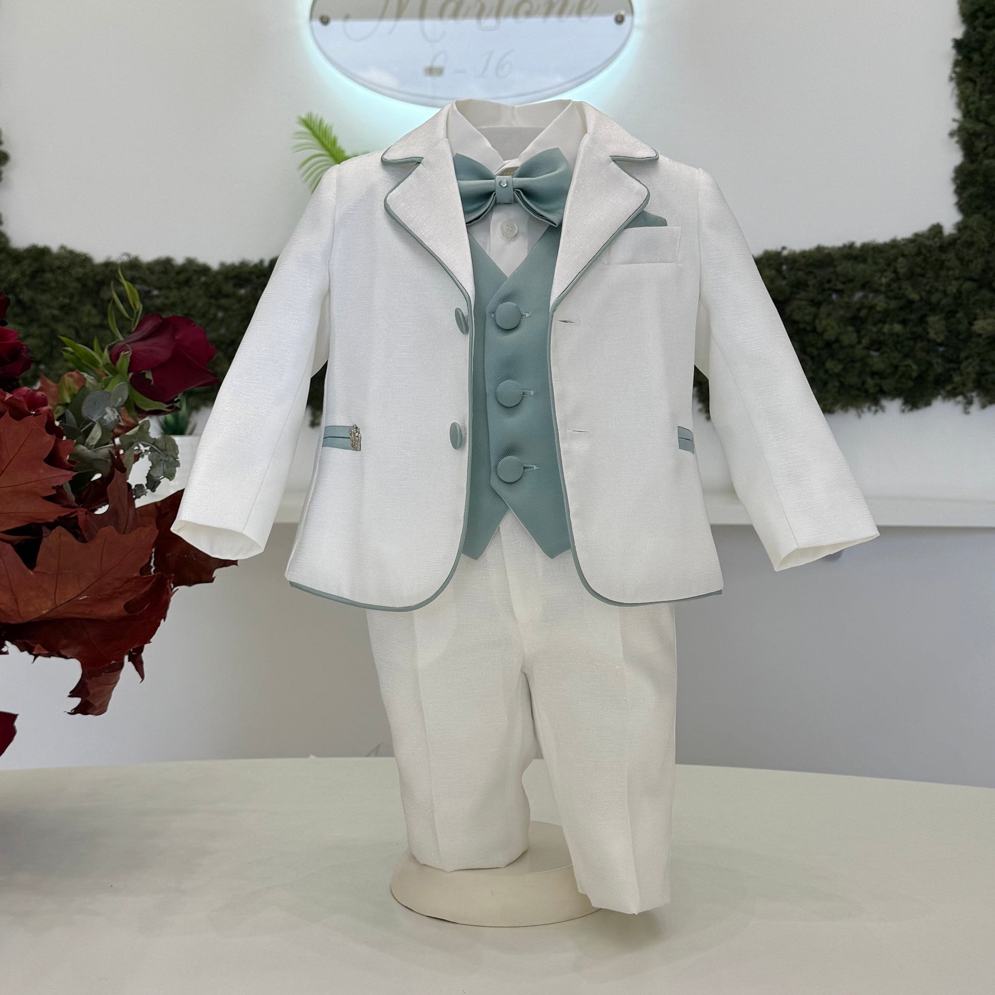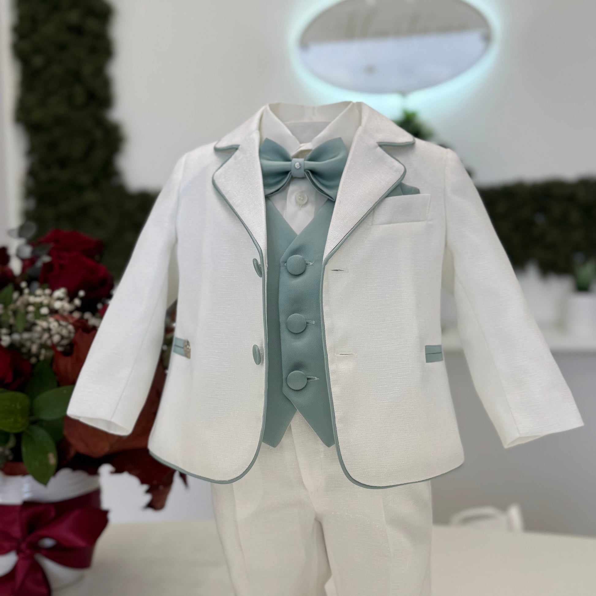 Un modello di raffinata eleganza, realizzato con cura sartoriale. La giacca bianca presenta profili in verde salvia e bottoni rivestiti, abbinata a gilet e papillon tono su tono per un contrasto delicato e sofisticato. La camicia bianca completa il completo con un tocco classico e impeccabile. Il pantalone segue una linea regolare, assicurando una vestibilità confortevole. Un abito dallo stile ricercato, perfetto per il battesimo e le cerimonie più eleganti.