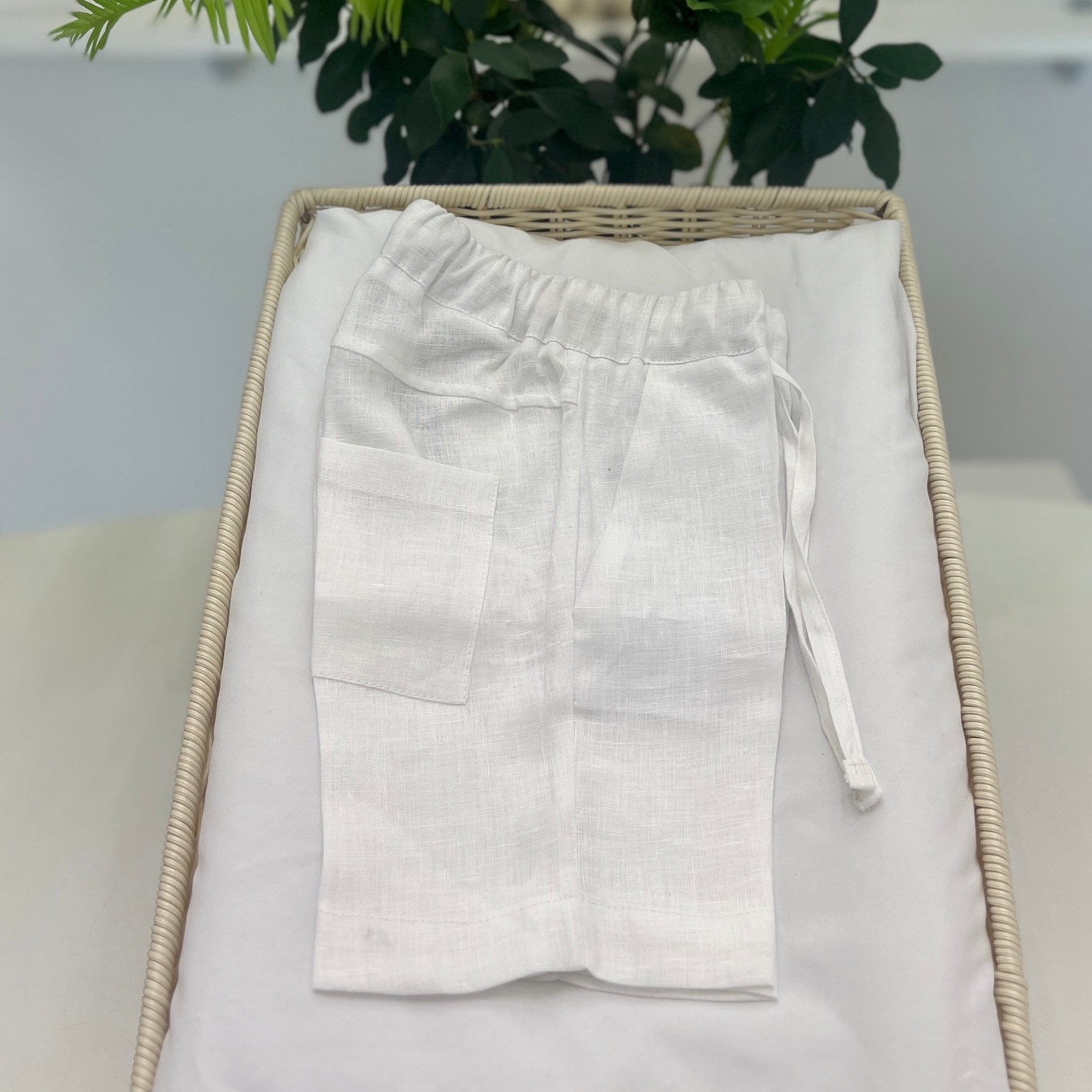 Bermuda in puro lino color panna, dal taglio essenziale e raffinato. Freschi e versatili, ideali per completare con eleganza l’outfit delle grandi occasioni.