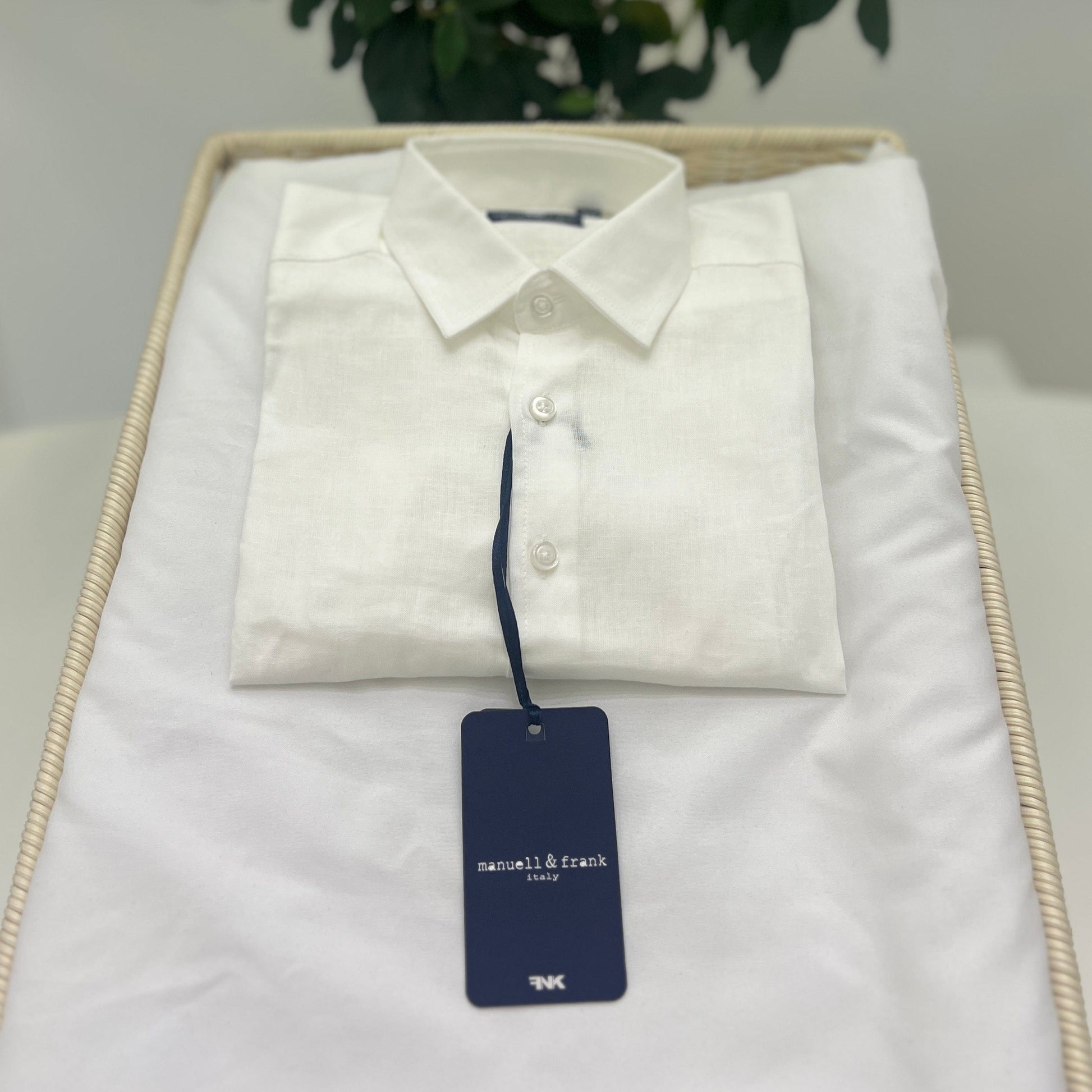 Camicia da bambino in puro lino panna con colletto classico e chiusura frontale con bottoni, dal design essenziale e traspirante, perfetta per occasioni eleganti nella stagione estiva.