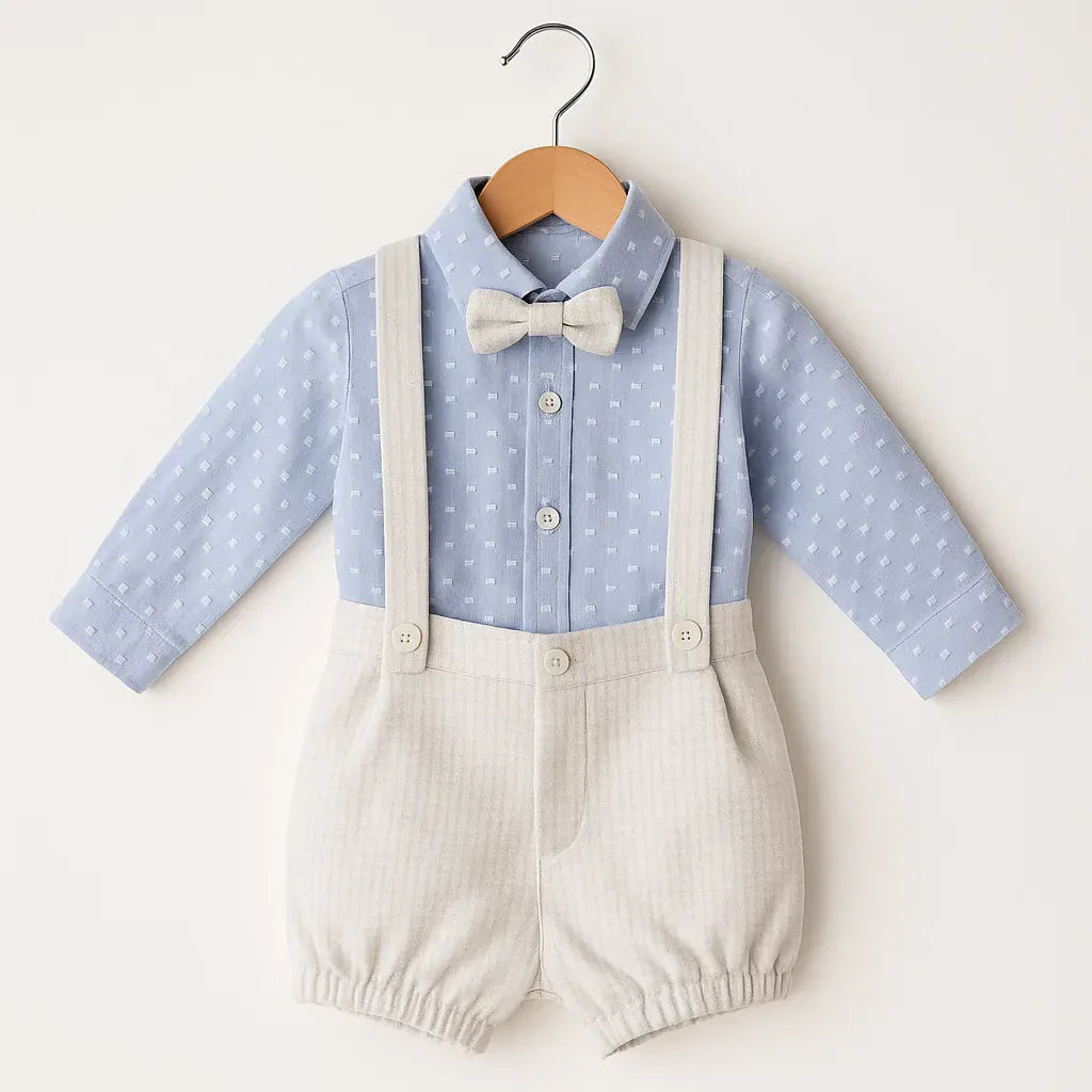 Completo elegante per neonato composto da camicia celeste con micro-fantasia e bottoni in tinta, papillon coordinato e shorts panna con bretelle applicate e fondo elasticizzato. Un insieme raffinato e delicato, perfetto per cerimonie e occasioni speciali.