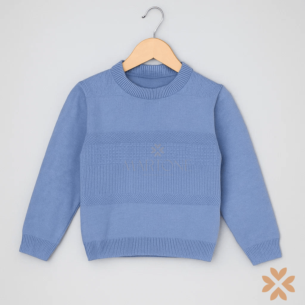 Maglioncino girocollo celeste in morbido cotone, impreziosito da raffinate lavorazioni a rilievo che ne esaltano la texture. Un capo versatile e ricercato, perfetto per completare con eleganza ogni look da cerimonia o per le occasioni più speciali.