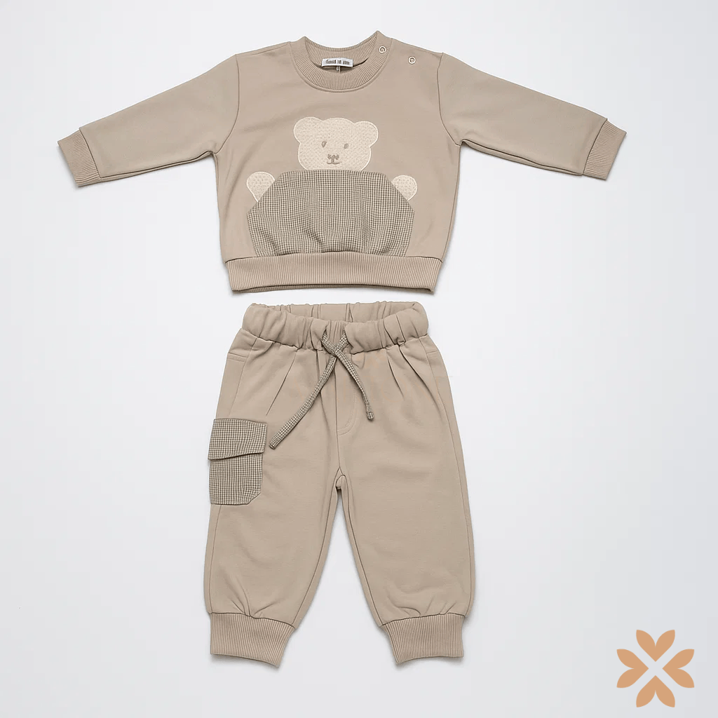 Tuta color tortora in tessuto morbido, composta da felpa con orsetto applicato e dettagli in microfantasia, abbinata a pantalone con fondo elasticizzato e tasca laterale coordinata. Un modello confortevole e curato nei dettagli, perfetto per un look pratico ma raffinato.