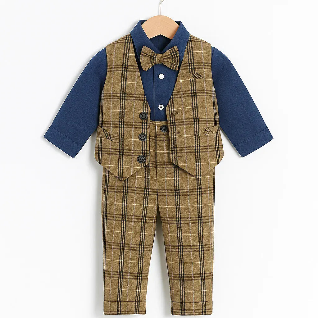 Completo elegante per neonato composto da camicia blu con colletto classico, gilet in fantasia check con bottoni a contrasto e papillon coordinato. I pantaloni abbinati, nello stesso motivo a quadri, completano l’insieme con un’eleganza decisa e ricercata. Un look impeccabile, ideale per cerimonie e occasioni speciali.