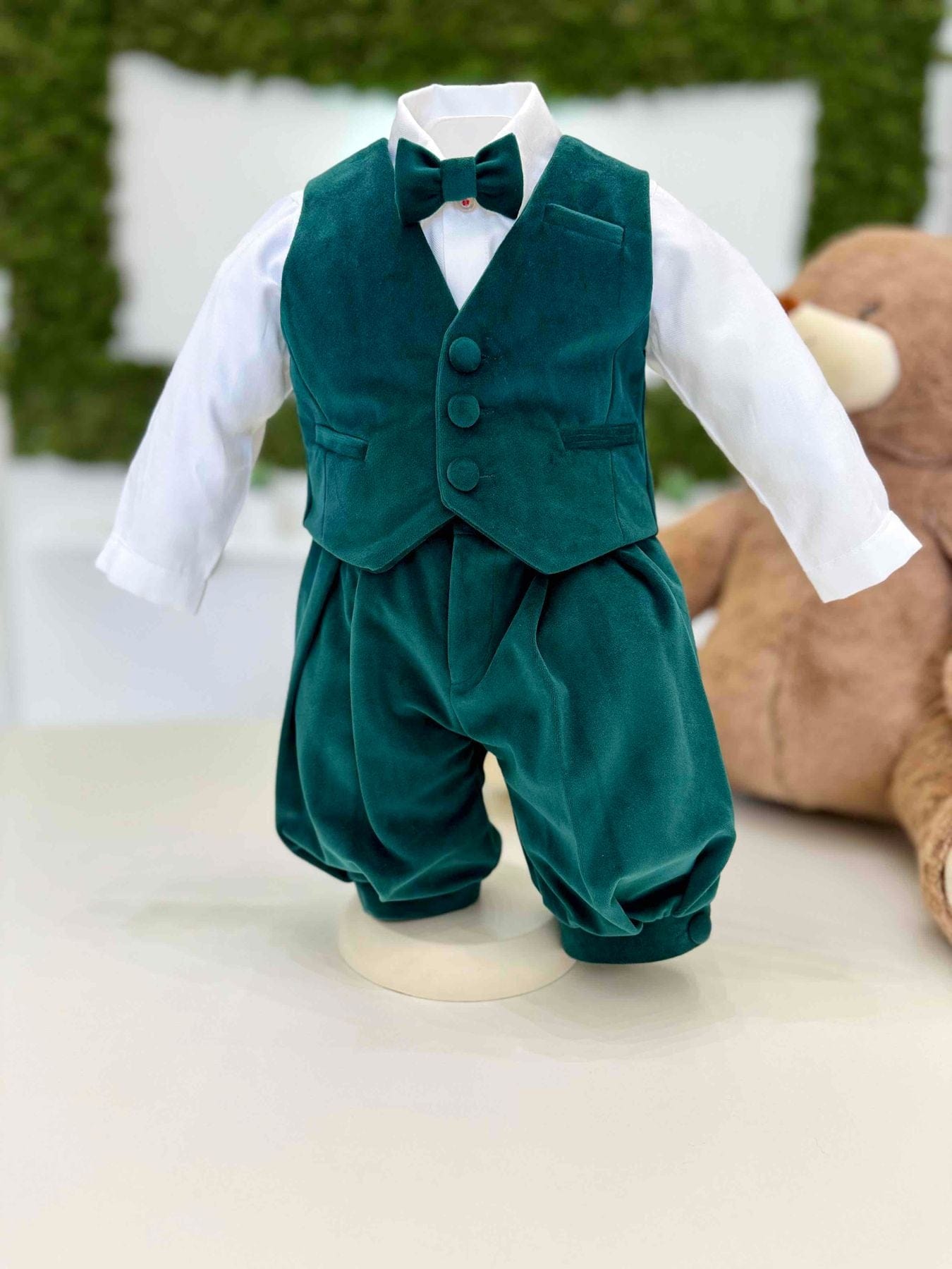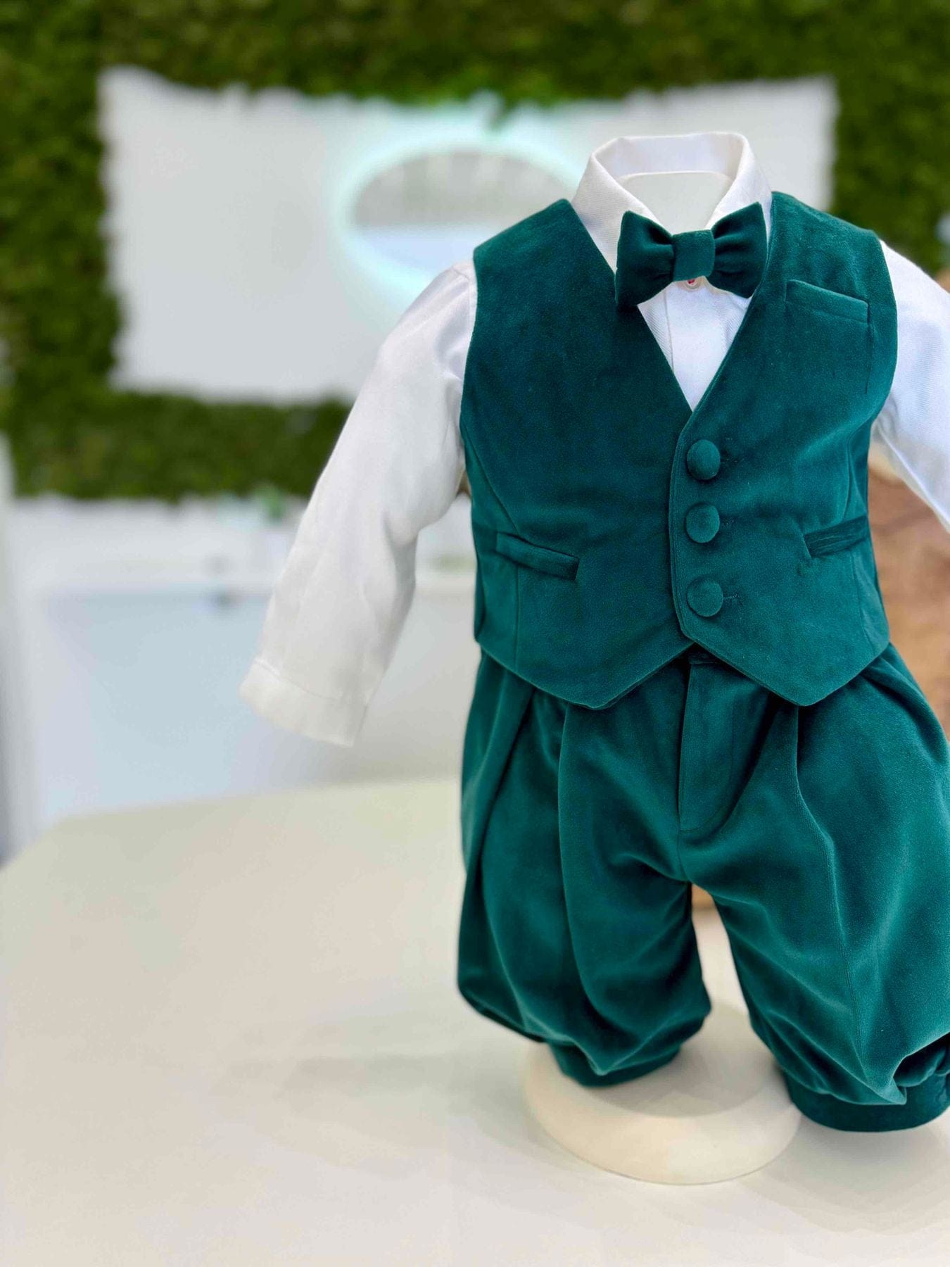 Completo gilet,papillon e pantalone zuava di velluto verde con camicia a body