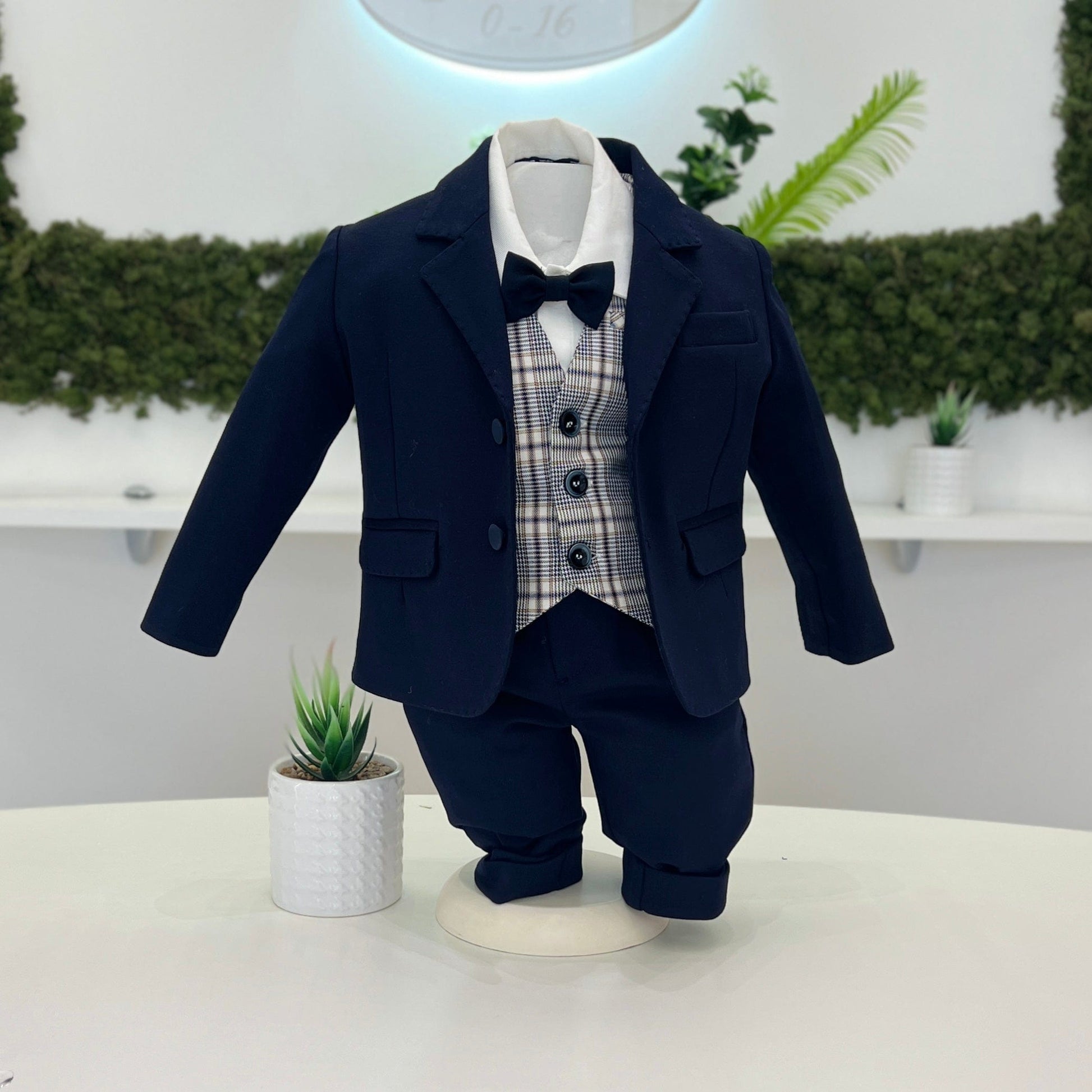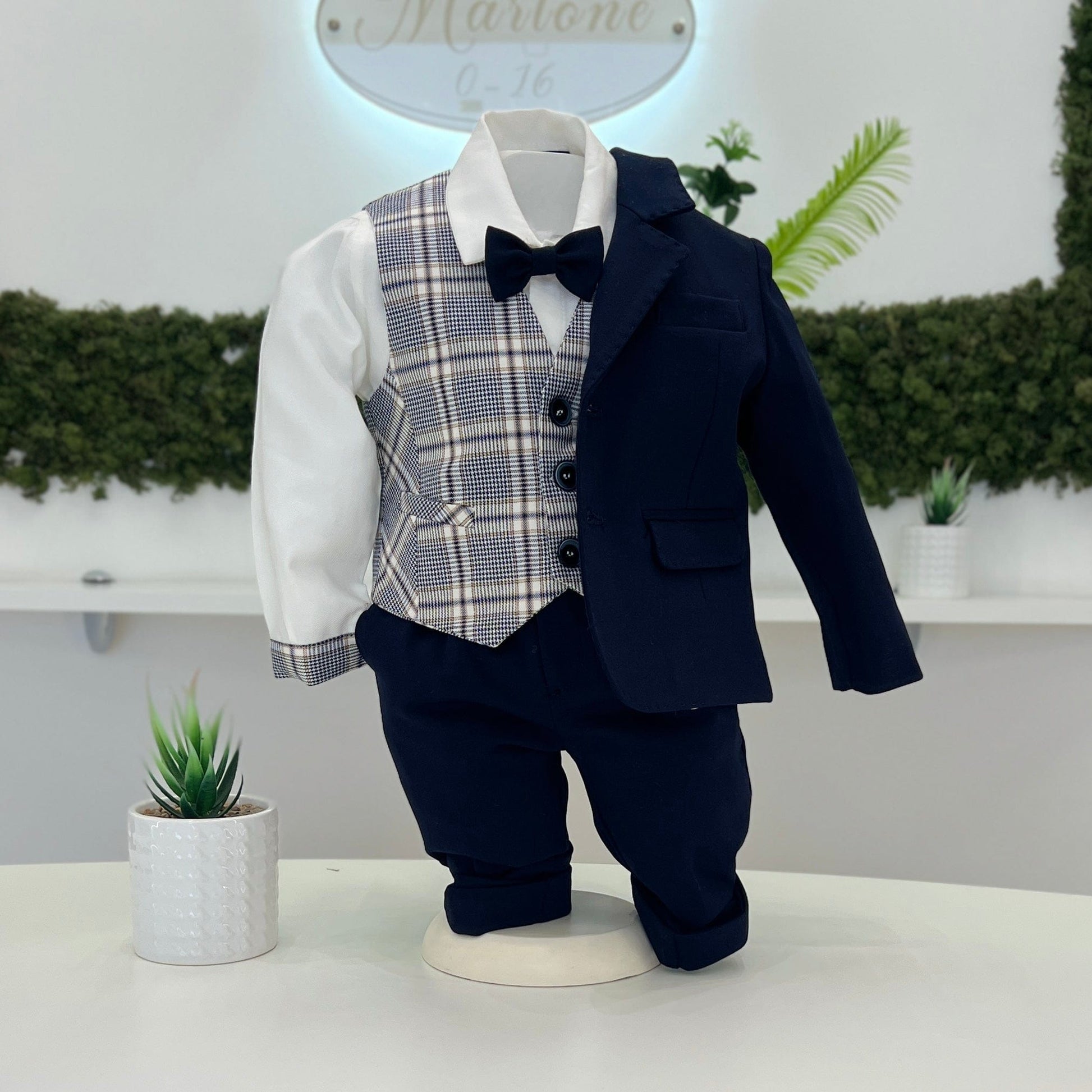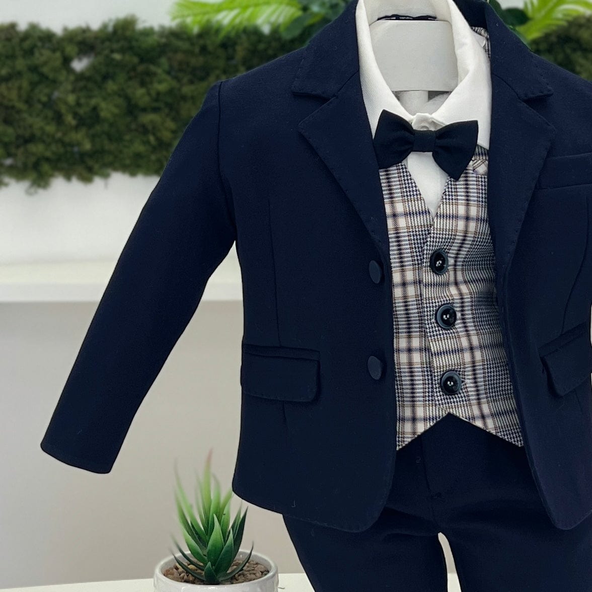 Completo elegante composto da giacca e pantalone in punto milano, gilet a quadri coordinato, camicia e papillon.