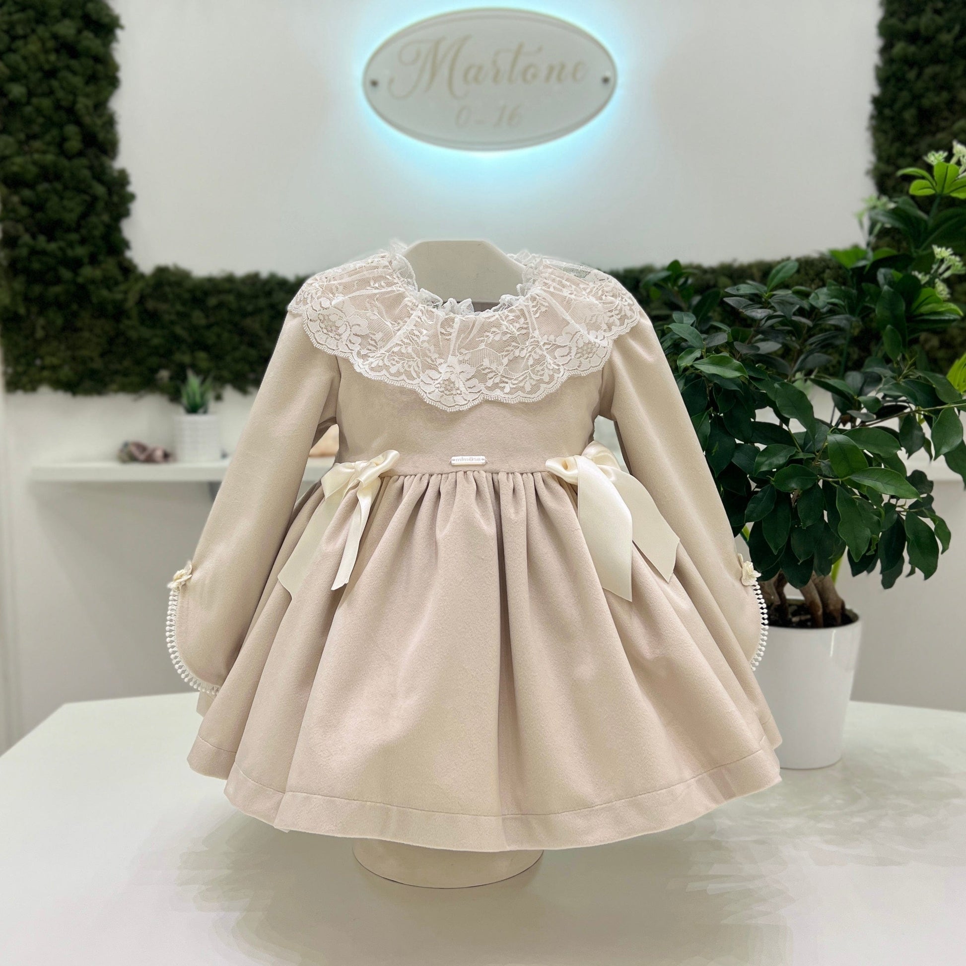 Abito in vellluto con manica rifinita con bordino in pizzo, fiocchi in raso e girocollo in pizzo. Cintura in tulle plumetis.