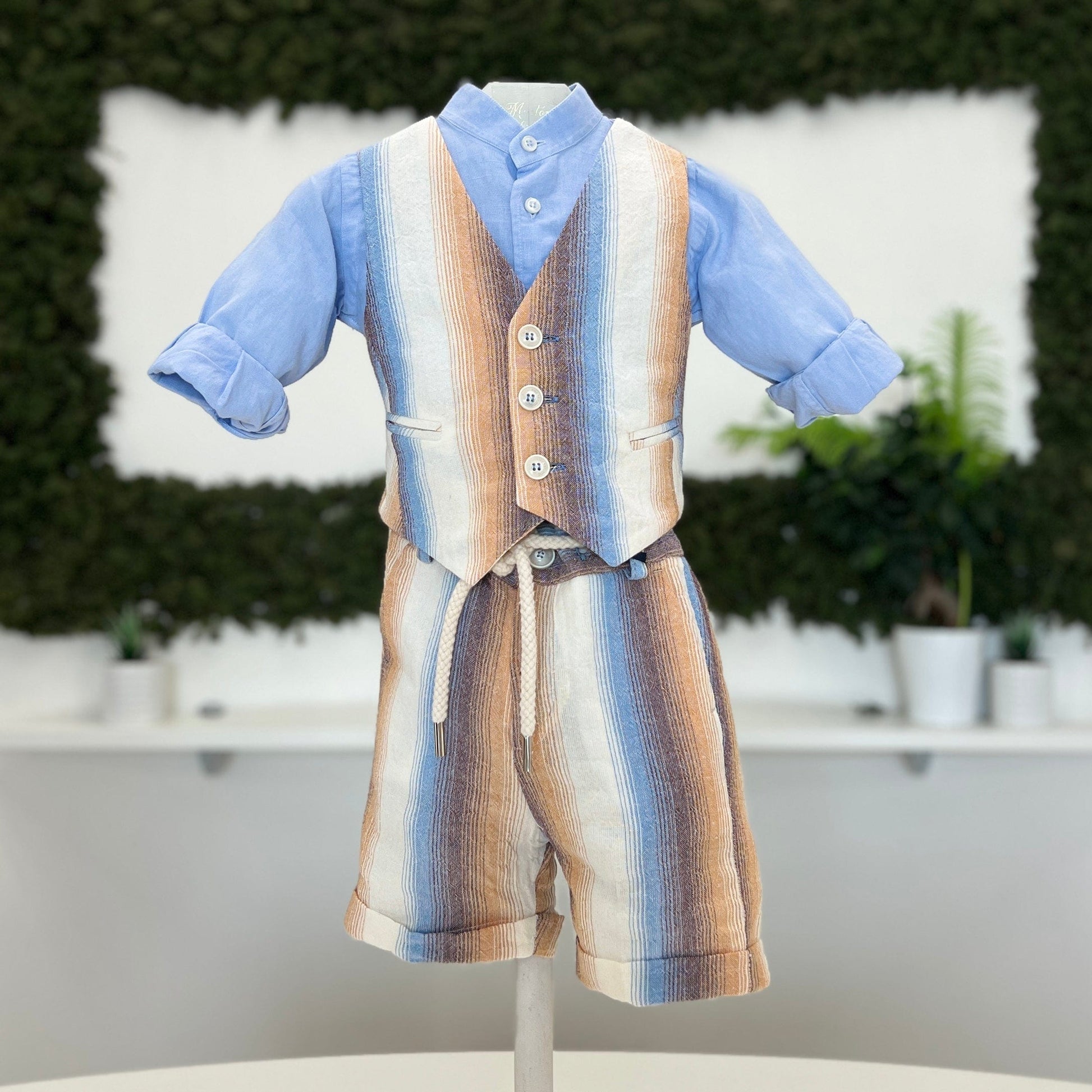 Completo bimbo in lino composto da bermuda con laccio in vita, gilet coordinato e camicia in lino con collo coreano e maniche con risvolti.