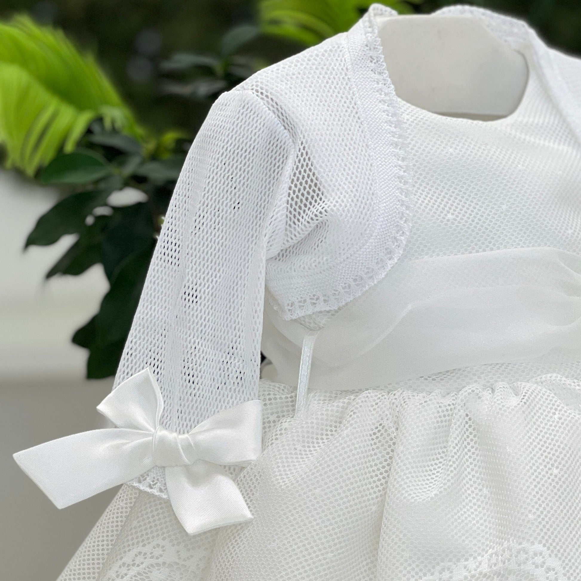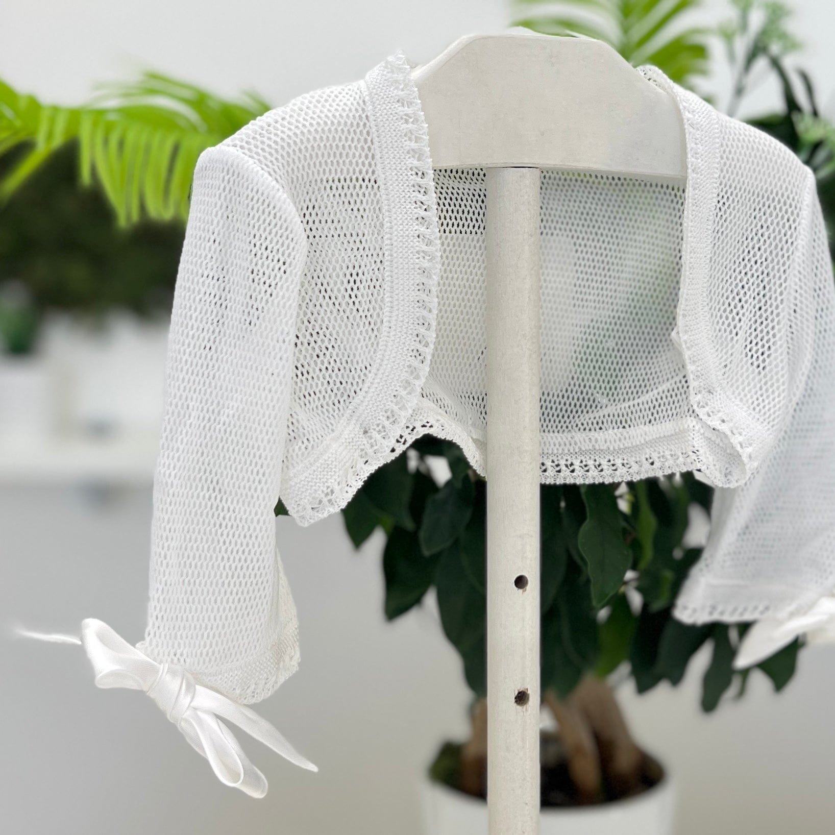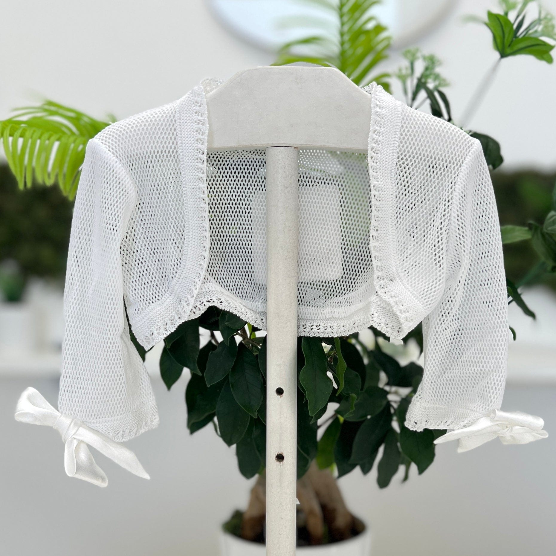 Un coprispalle aperto in microrete, ideale per la bimba, che unisce eleganza e delicatezza. Le maniche sono rifinite con fiocchi in raso, aggiungendo un tocco di raffinatezza e dolcezza. Perfetto per completare un abito da cerimonia, questo coprispalle è leggero e comodo, donando un aspetto sofisticato senza rinunciare alla praticità.