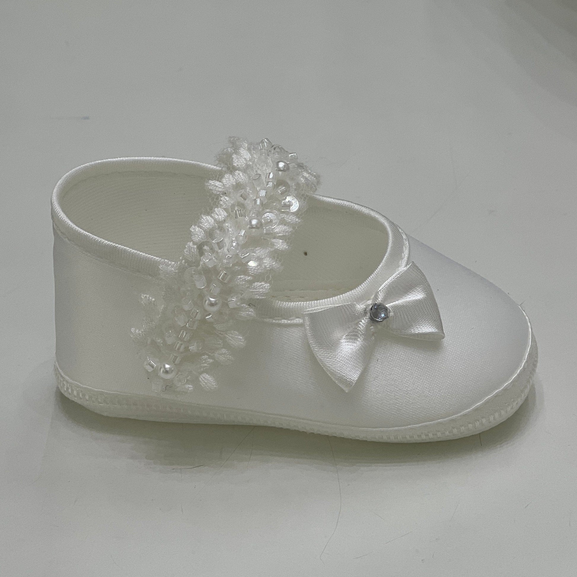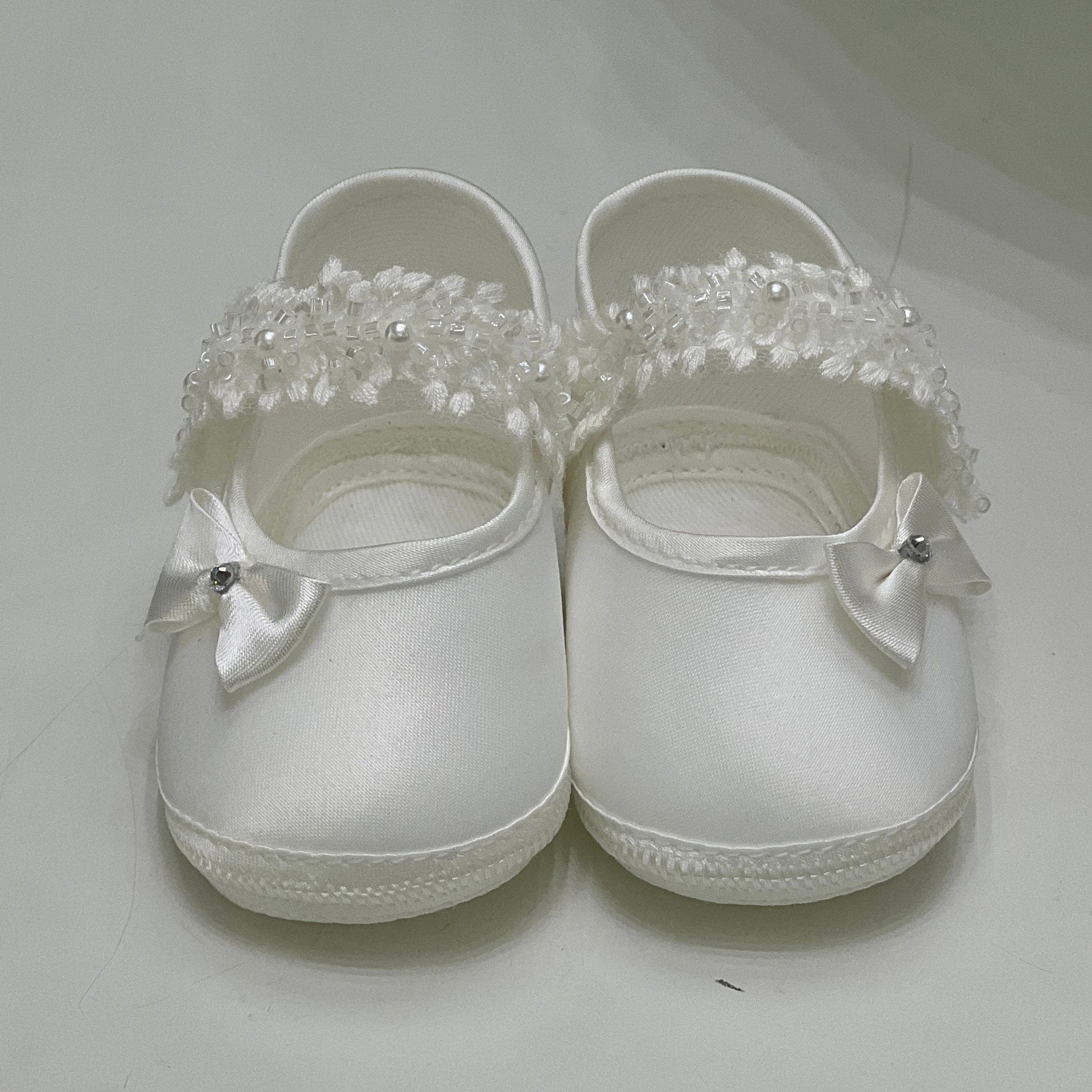 Scarpina battesimale per neonata, cinturino impreziosito da canottiglie con chiusura laterale e fiocchetto, un accessorio elegante e studiato nei minimi dettagli per completare il look della tua piccola nel giorno del suo battesimo.