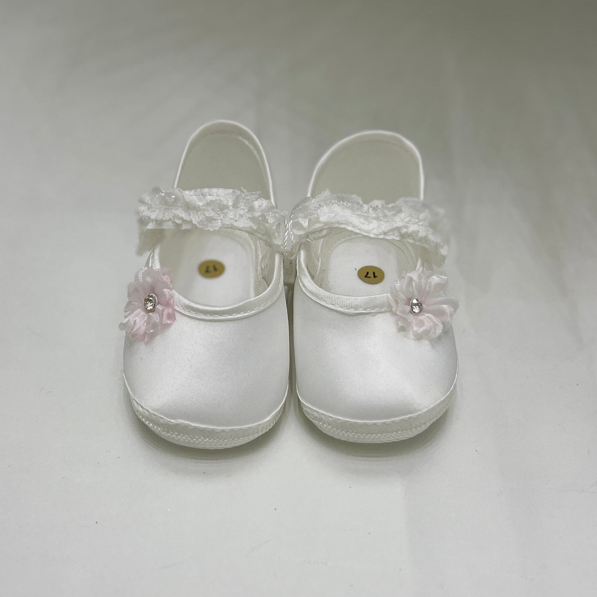 Scarpina battesimale per neonata, con chiusura laterale e fiorellino, un accessorio elegante e studiato nei minimi dettagli per completare il look della tua piccola nel giorno del suo battesimo.