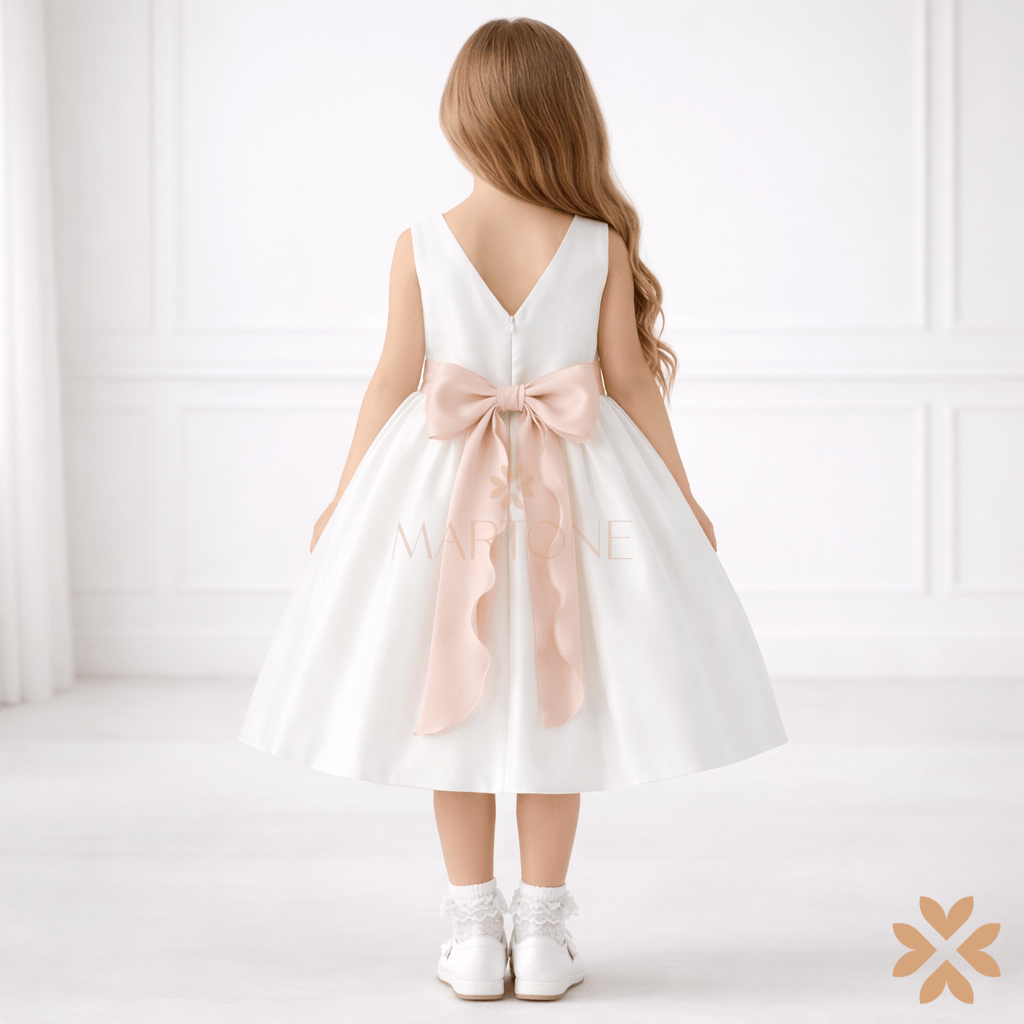 Abito sartoriale da cerimonia con corpino in mikado dalla struttura compatta e finitura luminosa. Scollo rotondo sul davanti con applicazione floreale decorativa sulla spalla. Vita valorizzata da fascia in raso con punto luce centrale. Gonna ampia a pieghe, costruita per garantire volume ordinato e linea elegante. Chiusura posteriore con zip invisibile. Realizzabile su misura, ideale per una cerimonia dallo stile raffinato e contemporaneo.