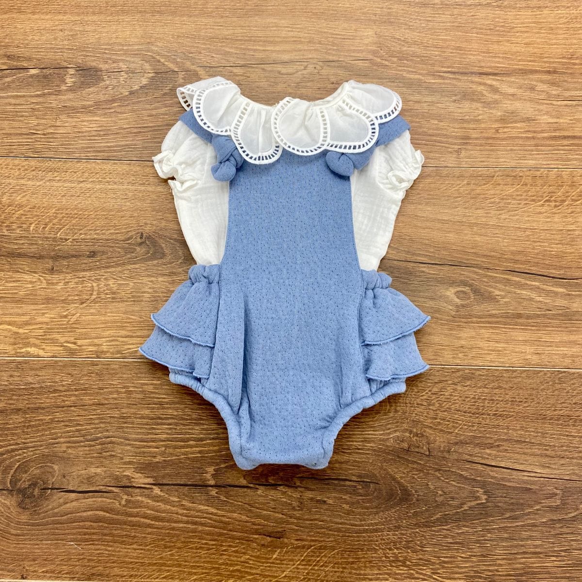 Salopette con camicetta con collo smerlato.