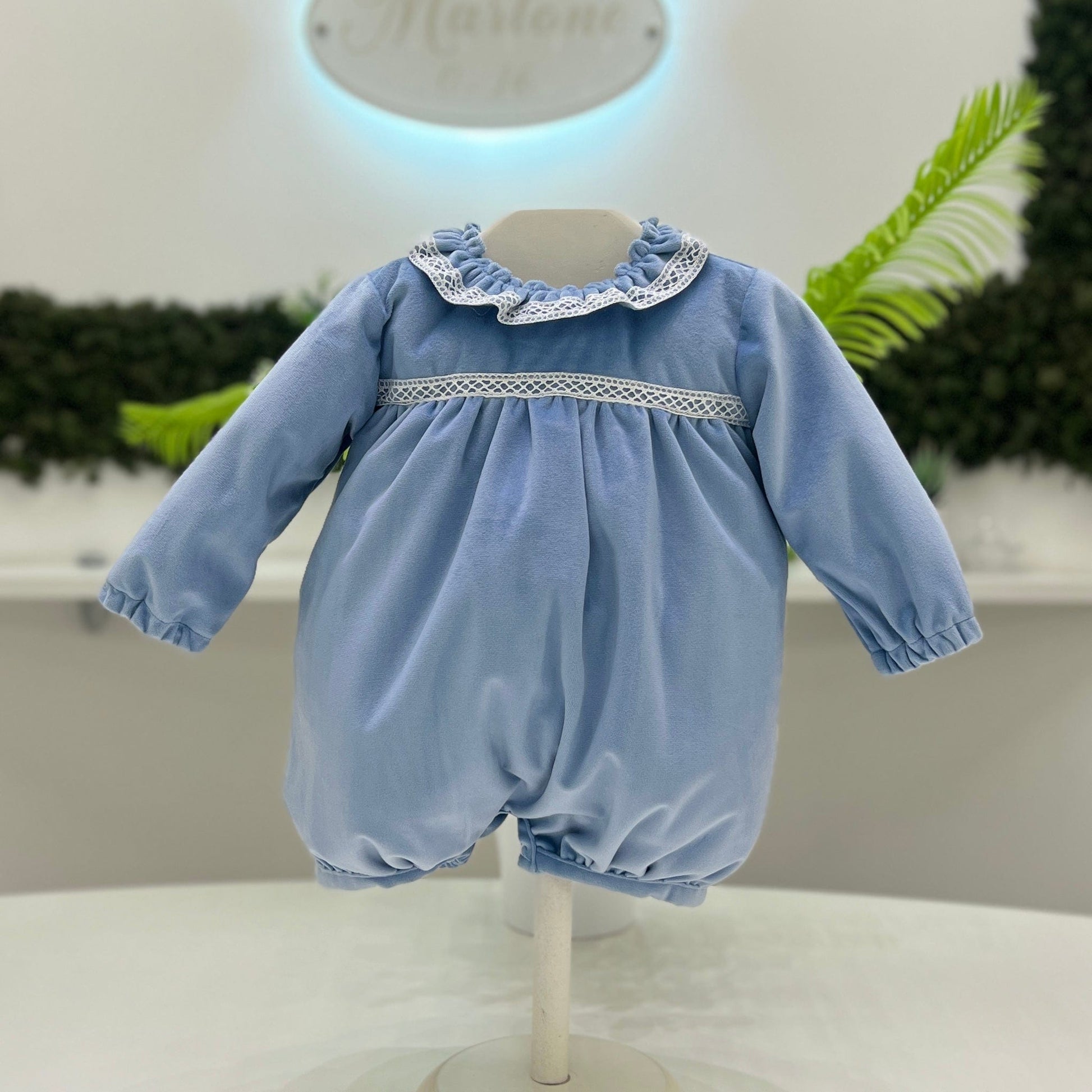 Pagliaccetto in velluto, manica lunga, collo arricciato e dettagli in pizzo.