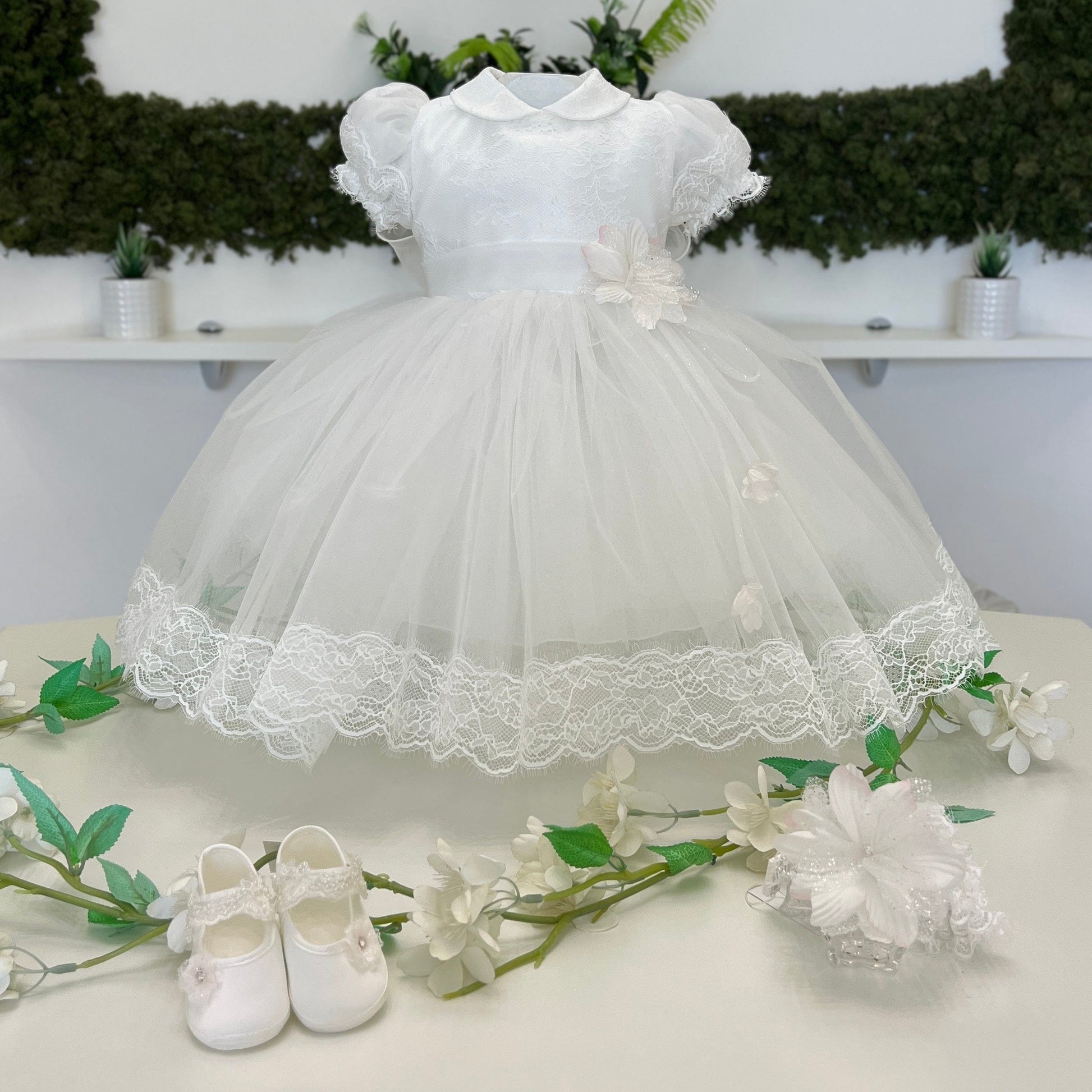Abito battesimale in tulle con corpino ricamato in pizzo e colletto tondo, impreziosito da maniche a sbuffo rifinite in pizzo. La gonna ampia in tulle è decorata con bordo in pizzo e applicazioni floreali laterali, arricchite da leggere sfumature rosa. Inclusi manicotti coordinati e culotte copripannolino.