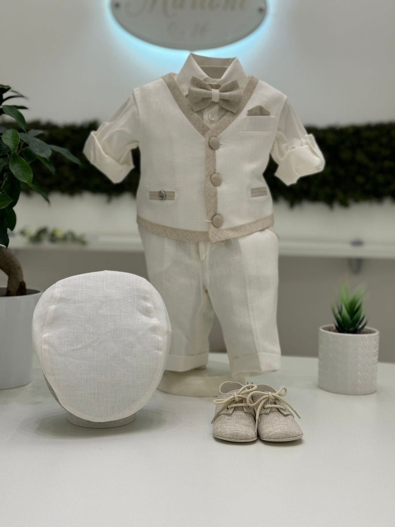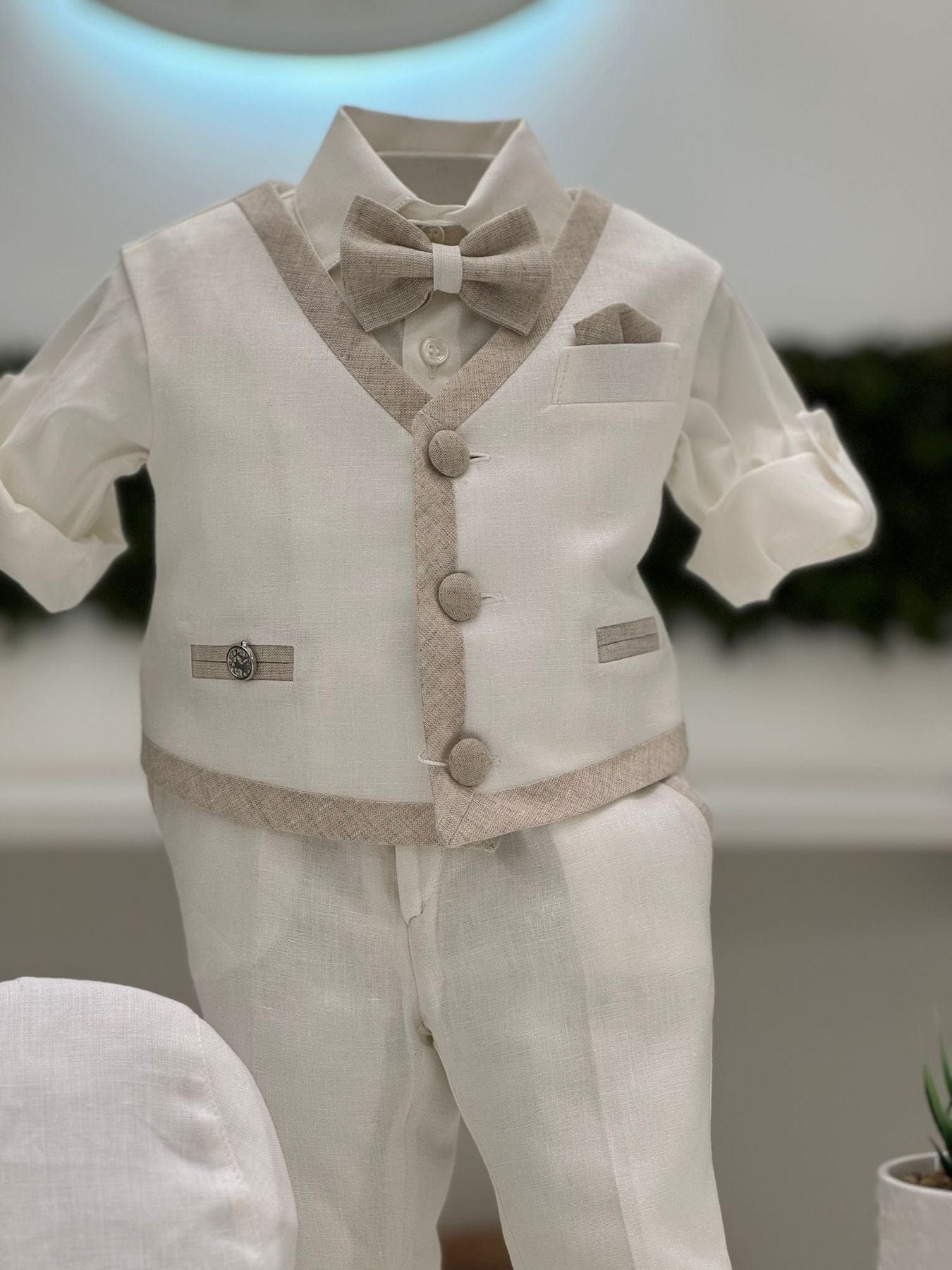 Abito battesimale 100% lino, composto da gilet con bordi e bottoni a contrasto in beige, camicia con manica a risvolto e papillon.