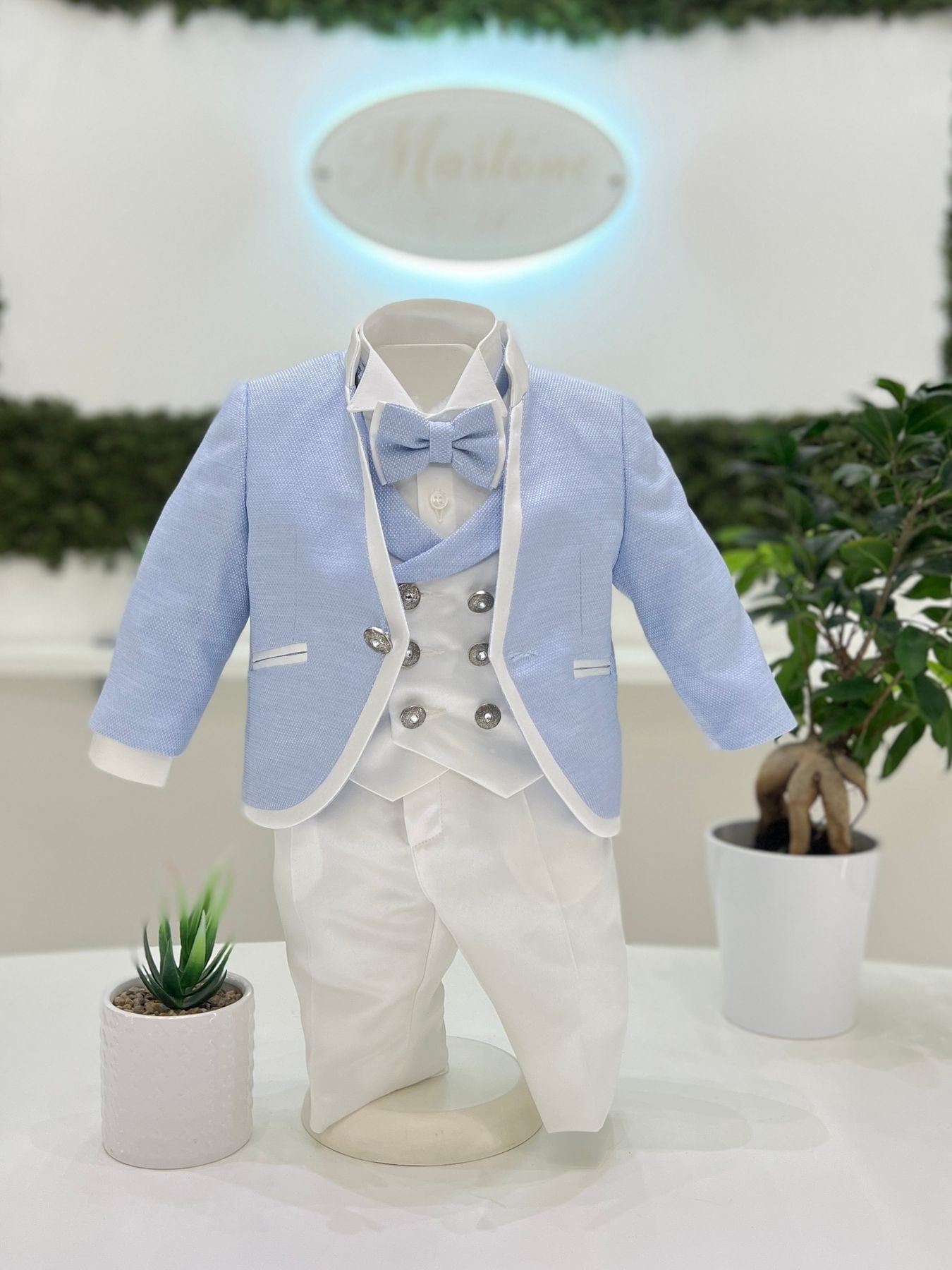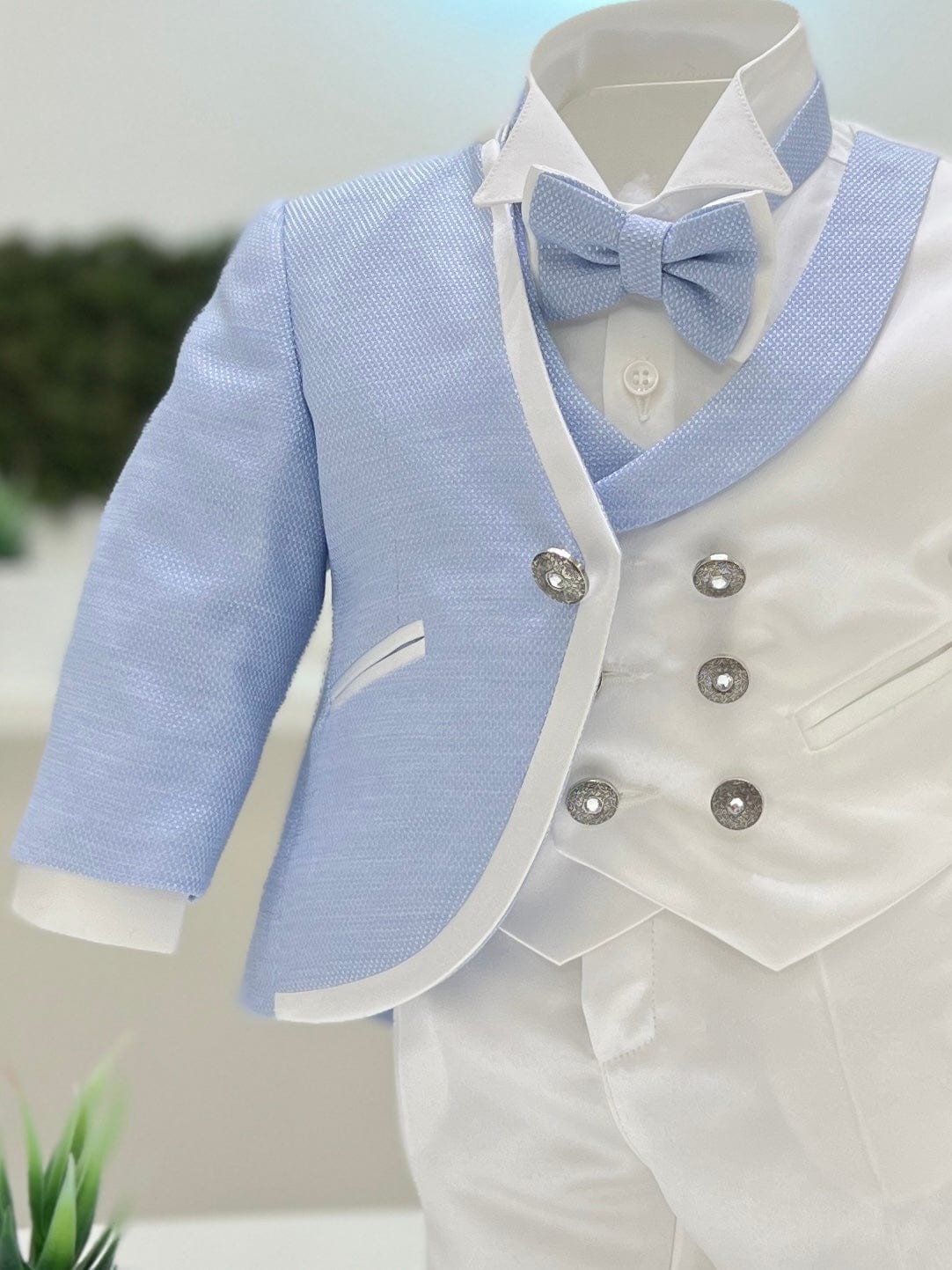 Gilet doppio petto bianco con bottoni gioiello e collo sciallato.