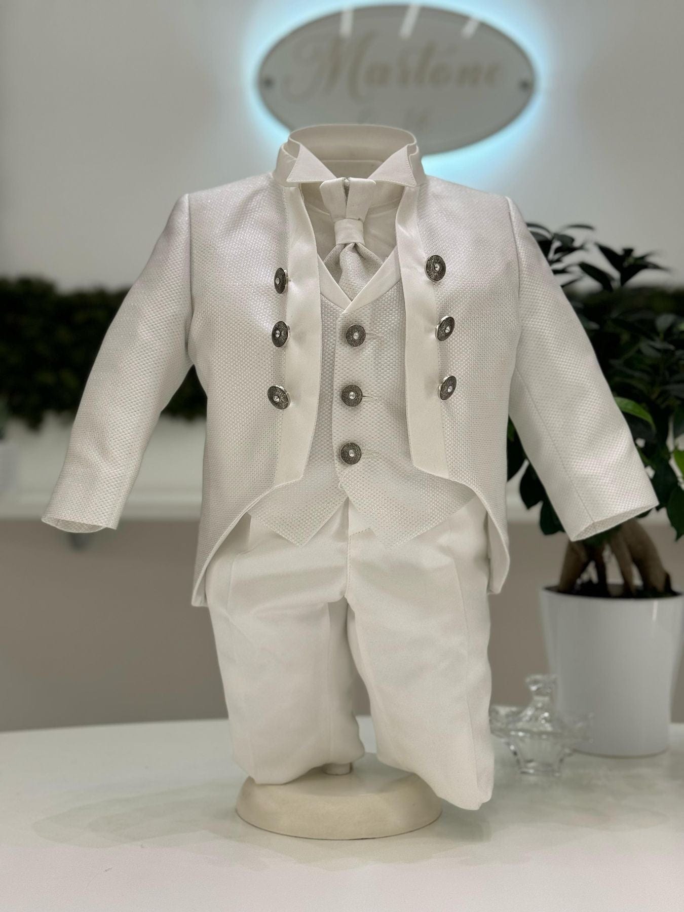 Abito battesimale sartoriale 5 pezzi: giacca, camicia, pantalone, gilet e papillon.