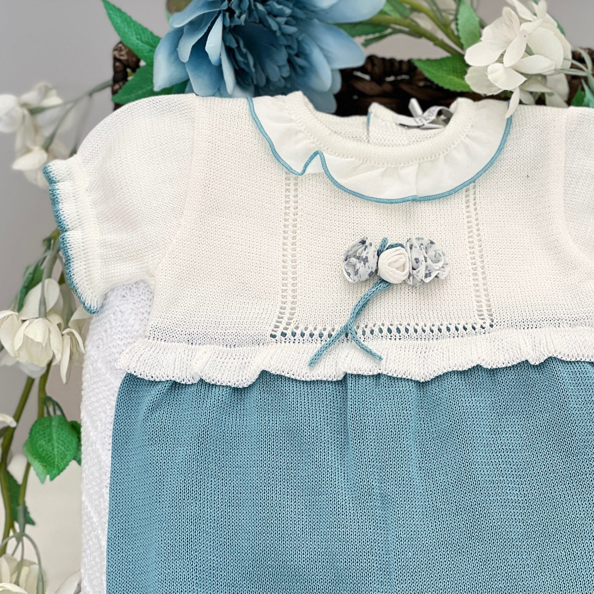Grazioso completo in filo di cotone con colori a contrasto bianco e verde acqua.
