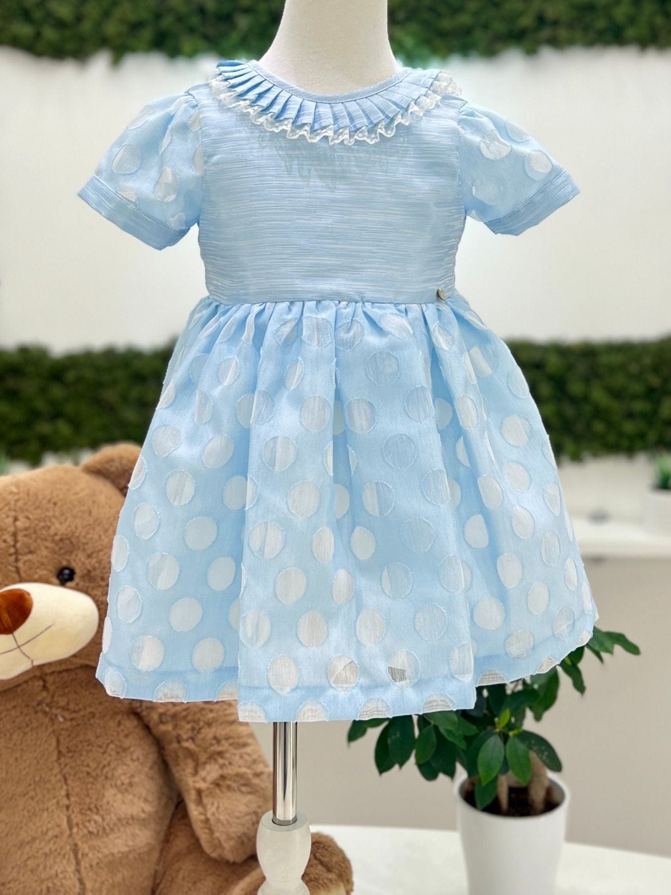 Abito bimba in organza a pois, con girocollo in plissè e pizzo. Abbottonatura sul retro con perline e fiocco.