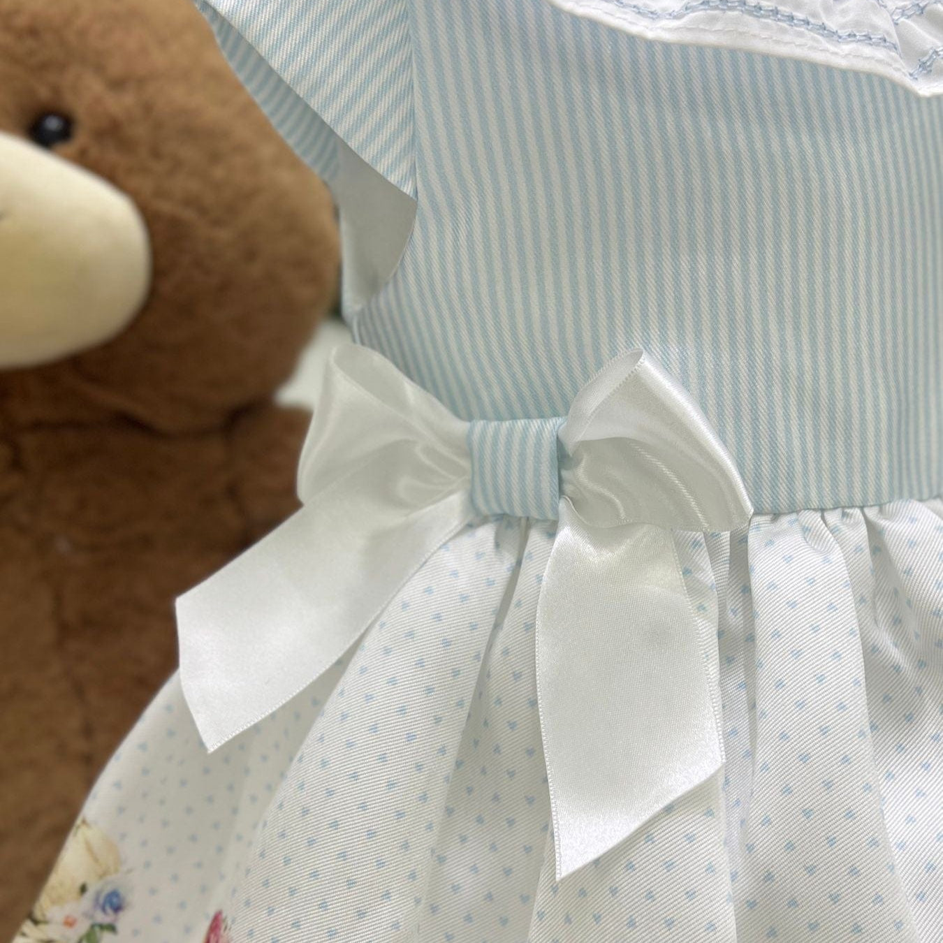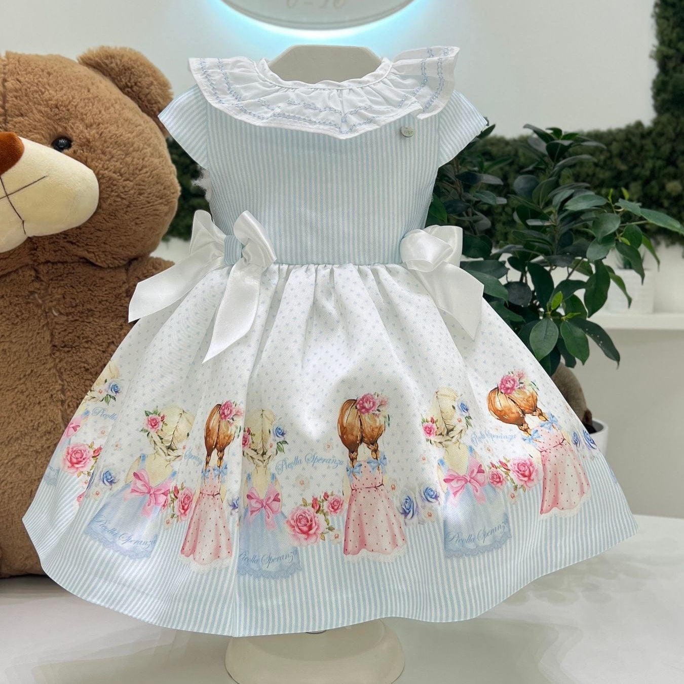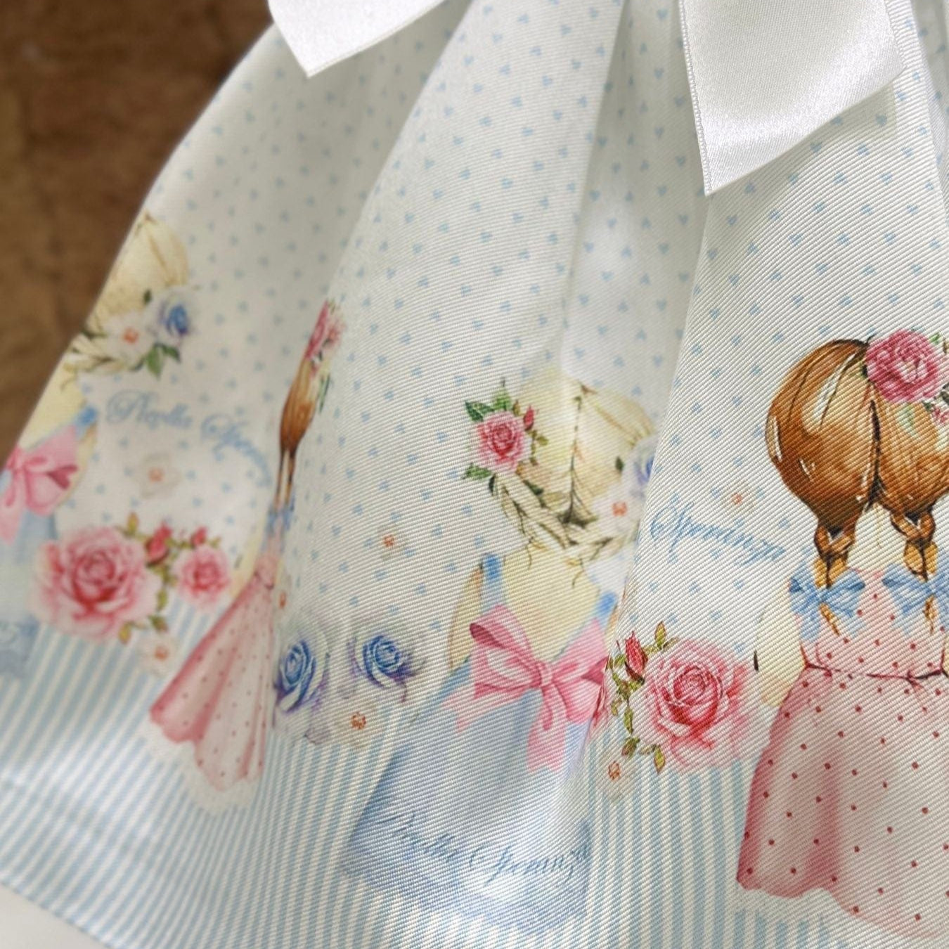 Abito in mikado con stampa a righe e bambole, fiocchetti in raso in vita e girocollo con rouches.