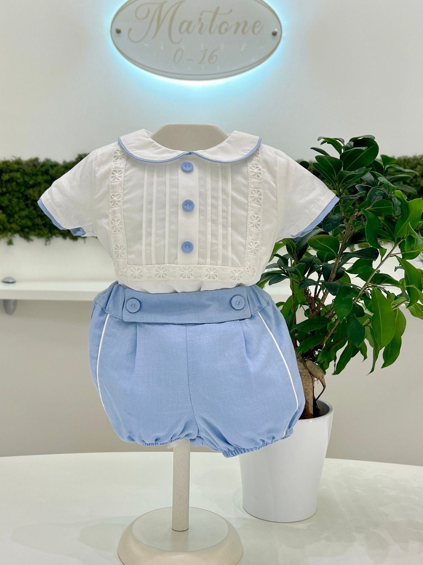 Completo due pezzi neonato composto da camicia in cotone con ricami e pieghe frontali e pantaloncino celeste in cotone con bordino bianco.