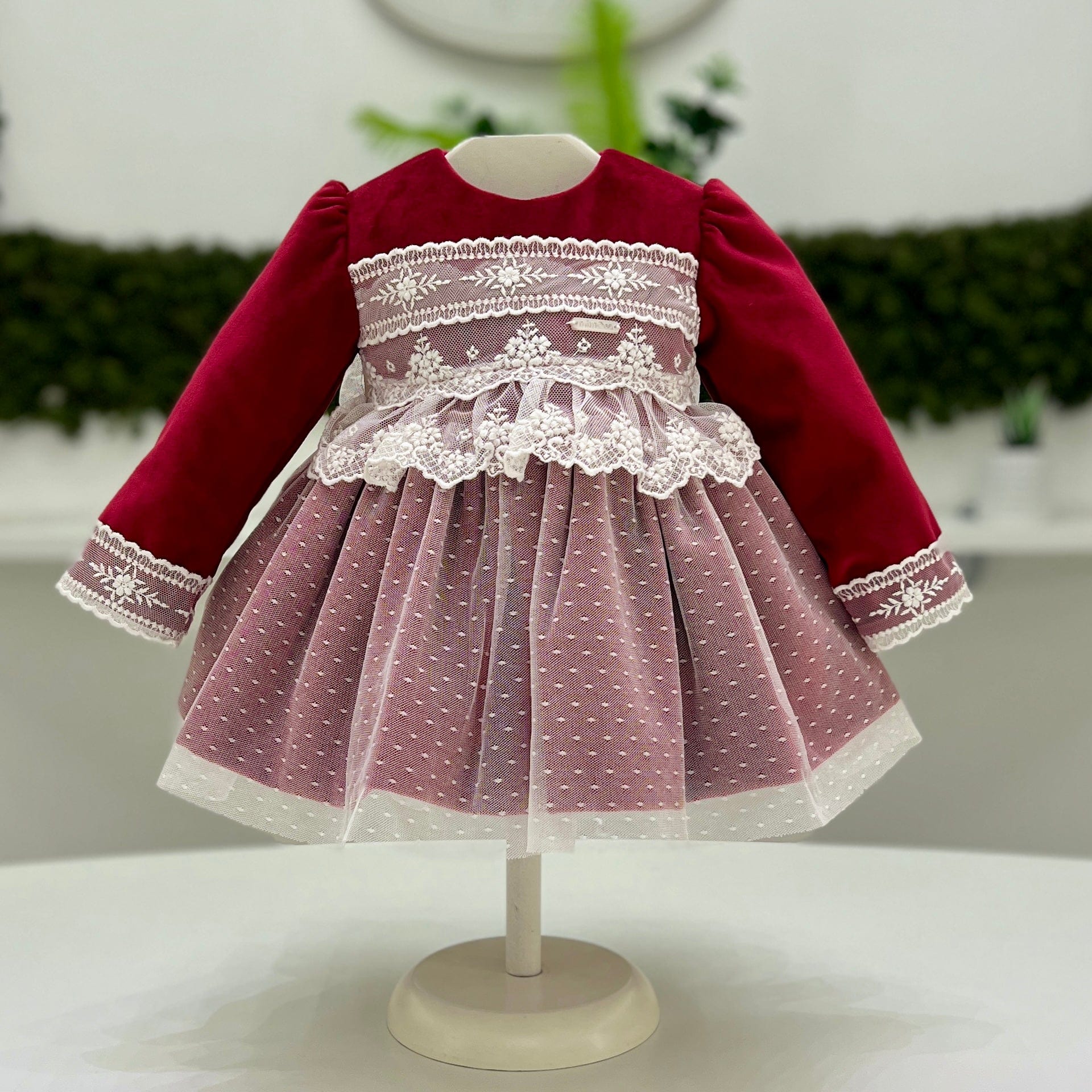 Abito in velluto, rifinito da uno strato di tulle plumetis e e corpetto lavorato da rouches in merletto, replicate anche sui bordi delle maniche.