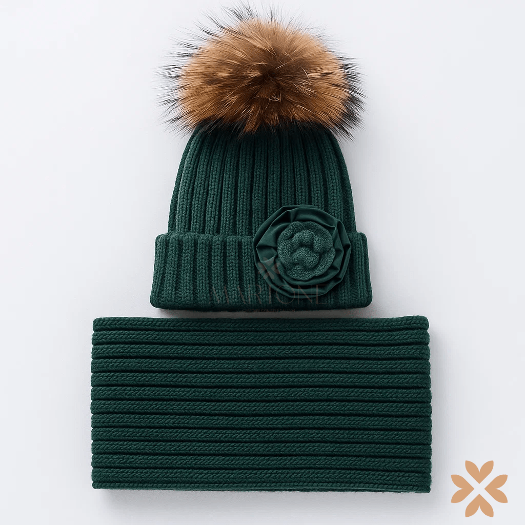 Set in maglia a costine composto da cappello con maxi pon pon in eco-pelliccia e dettaglio applicato a fiore laterale. Sciarpa coordinata in tinta unita, morbida e avvolgente. Un accessorio ideale per affrontare la stagione fredda con stile. Perfetto per completare i look più raffinati.
