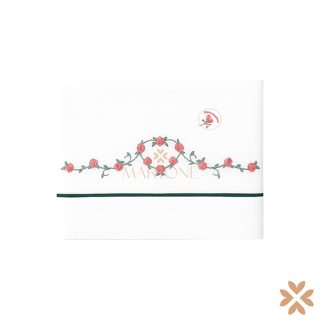 Lenzuolino in cotone bianco, decorato con un delicato ricamo di roselline rosa e tralci verdi, impreziosito da un profilo verde salvia in contrasto. Un coordinato elegante e raffinato, ideale per culle e carrozzine, perfetto per accogliere la neonata con dolcezza e stile.