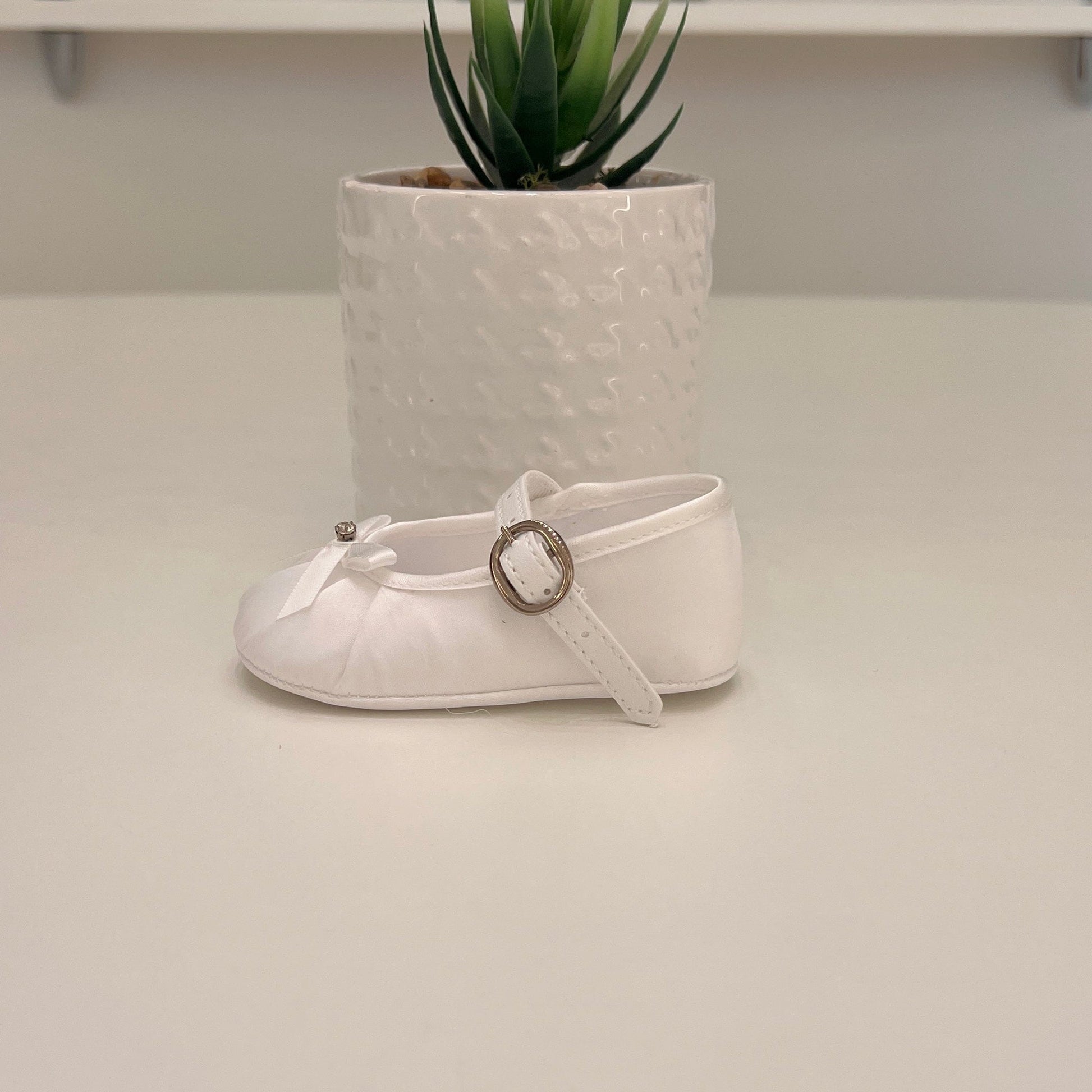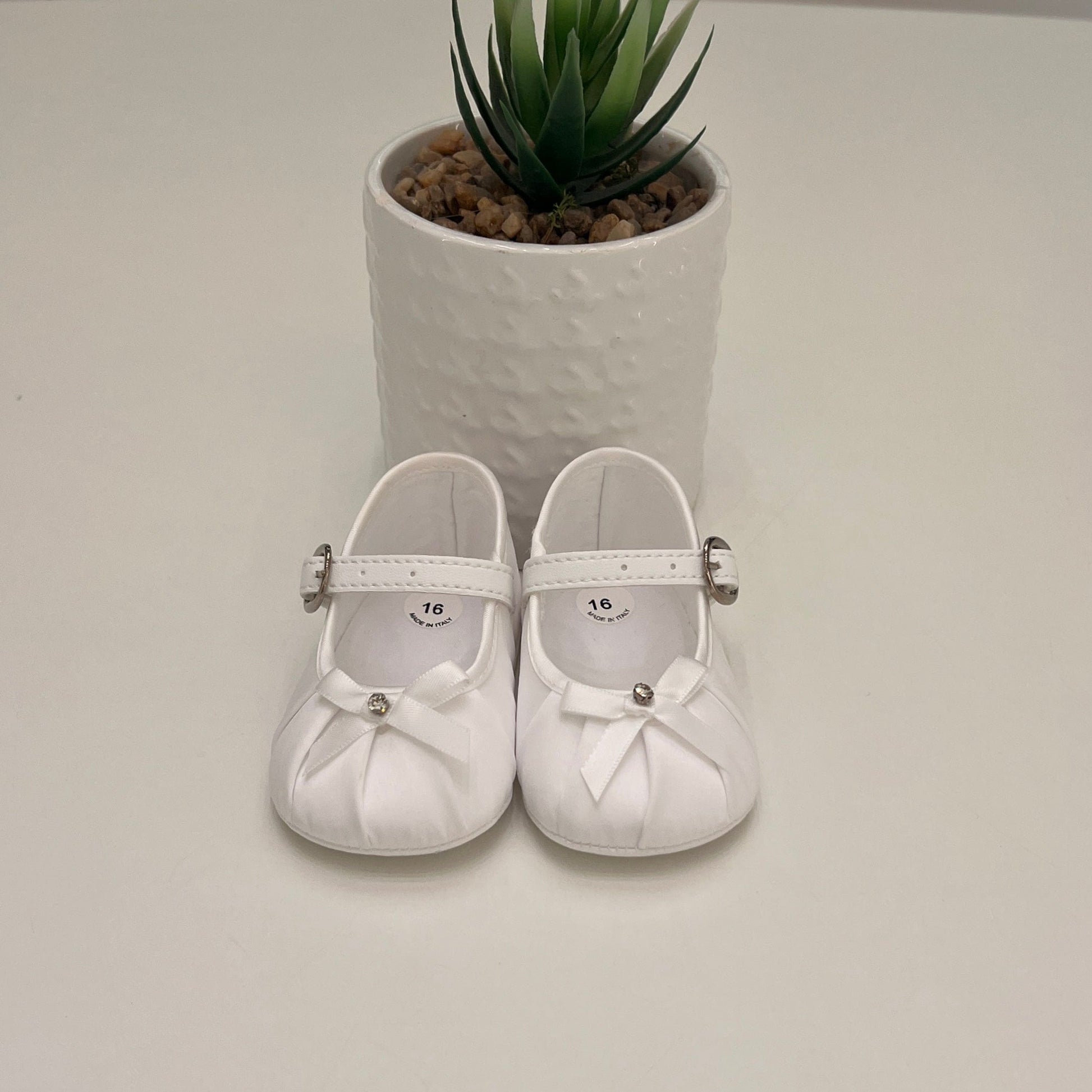 Scarpine da cerimonia in raso bianco, decorate con fiocco e piccolo dettaglio gioiello. Chiusura con cinturino regolabile e fondo morbido, ideali per completare con eleganza l’outfit della piccola.