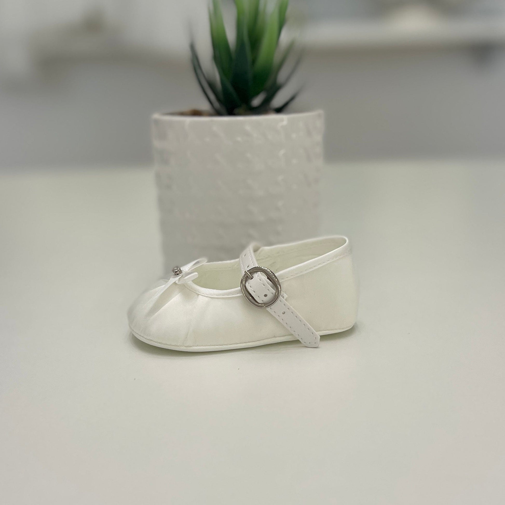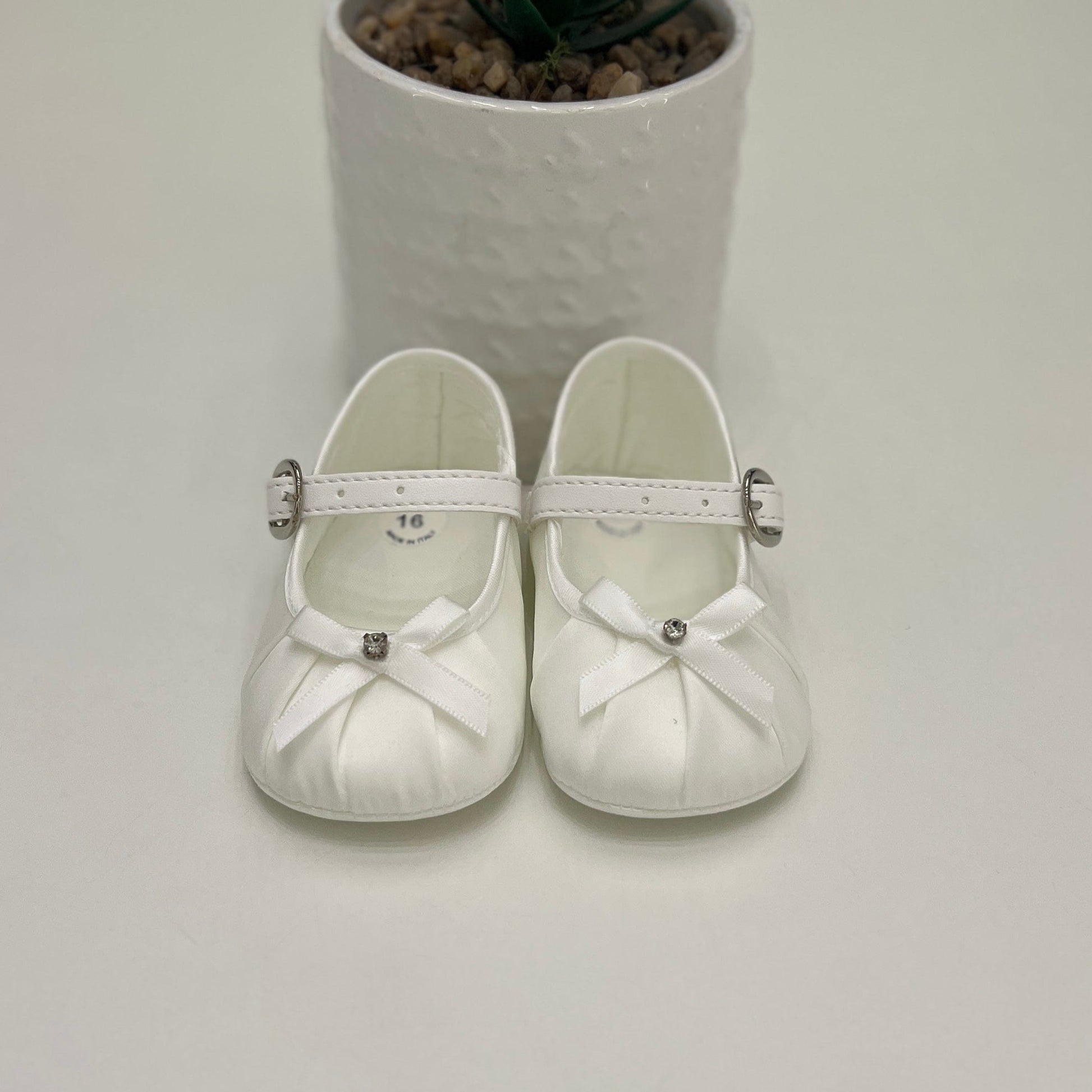 Scarpine da cerimonia in raso panna, decorate con fiocco e piccolo dettaglio gioiello. Chiusura con cinturino regolabile e fondo morbido, ideali per completare con eleganza l’outfit della piccola.