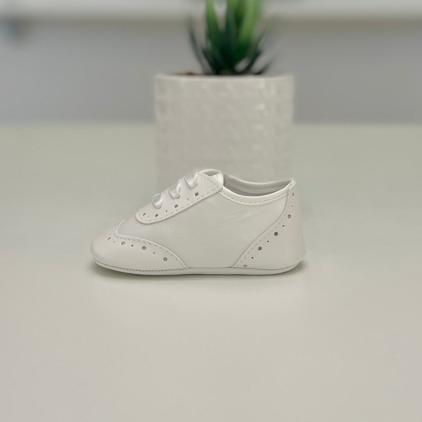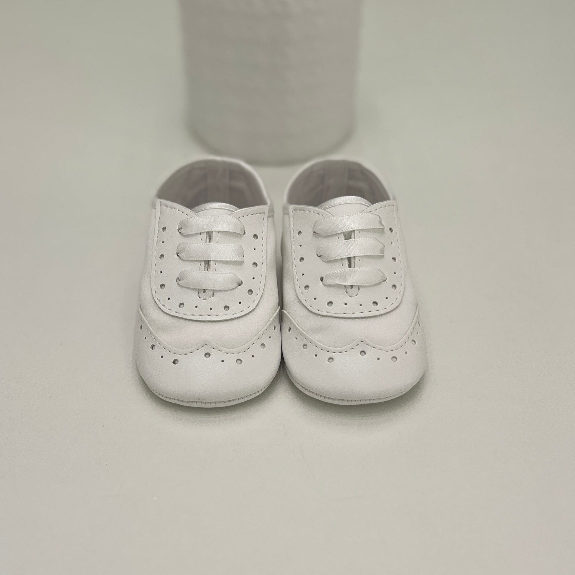 Scarpine da cerimonia neonato in raso e pelle bianca, con stringatura in raso e dettagli traforati. Fondo morbido e calzata confortevole, ideali per un look elegante e raffinato.