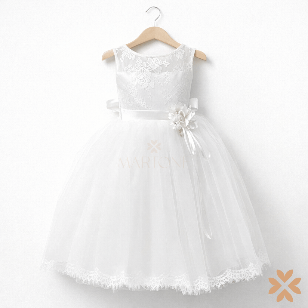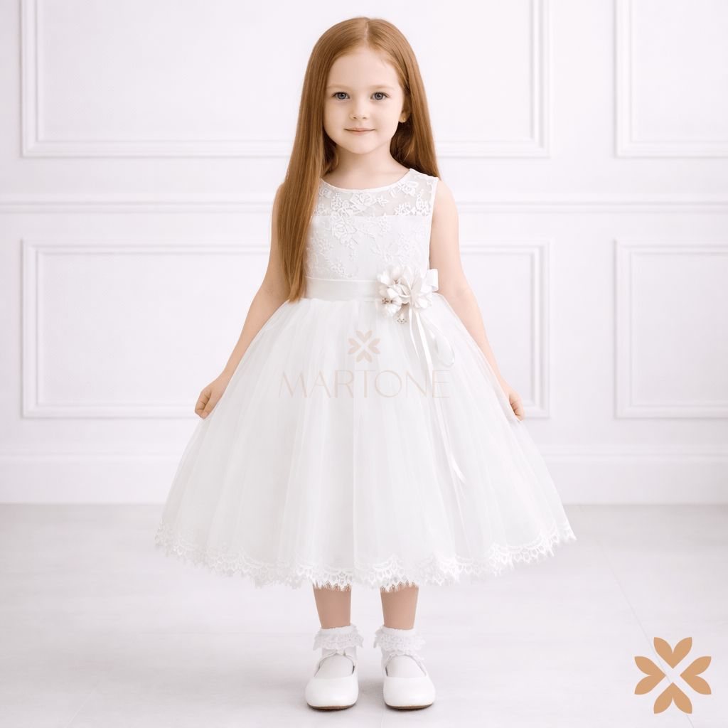 Abito elegante da cerimonia, con corpetto in pizzo chantilly con trasparenza, gonna in tulle rifinita in pizzo chantilly, cintura in vita in mikado con spilla floreale e punti luce.