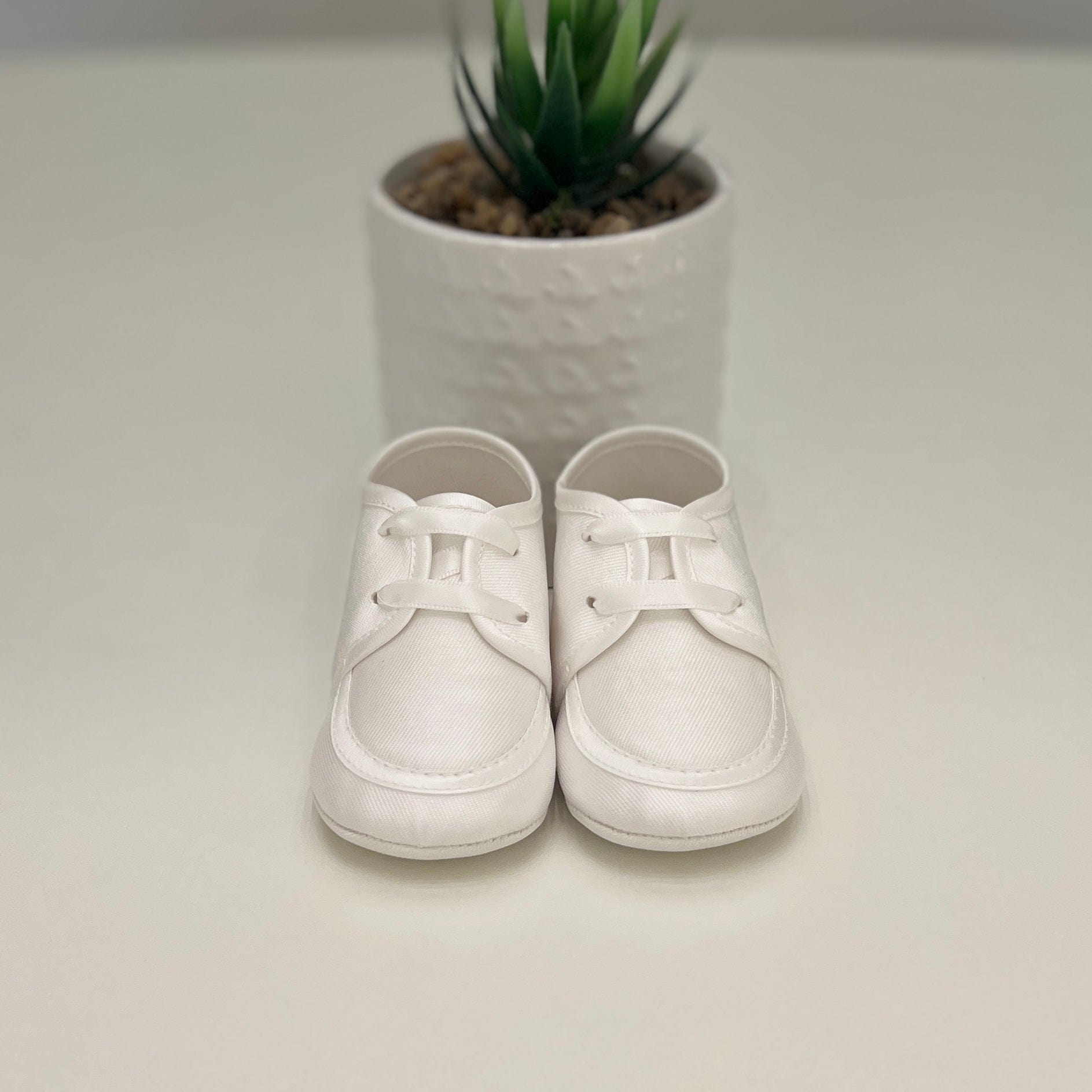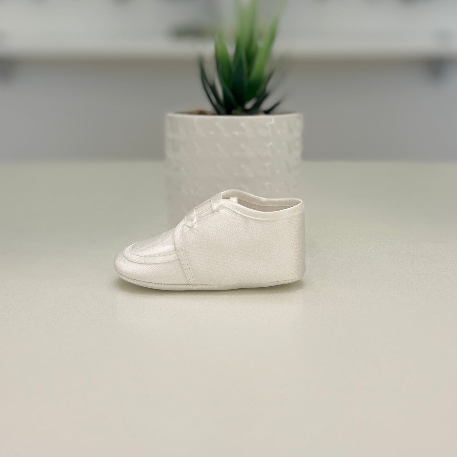 Scarpine da cerimonia neonato in raso panna, con allacciatura a stringhe e fondo morbido. Un modello semplice ed elegante, perfetto per le prime occasioni speciali.